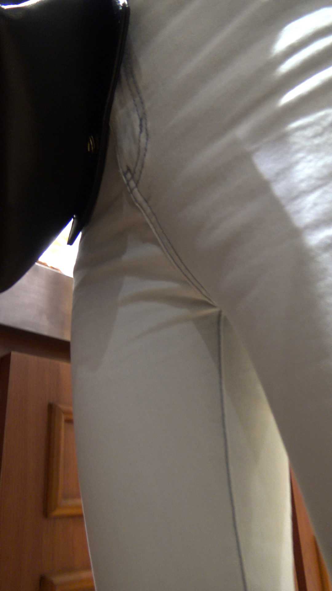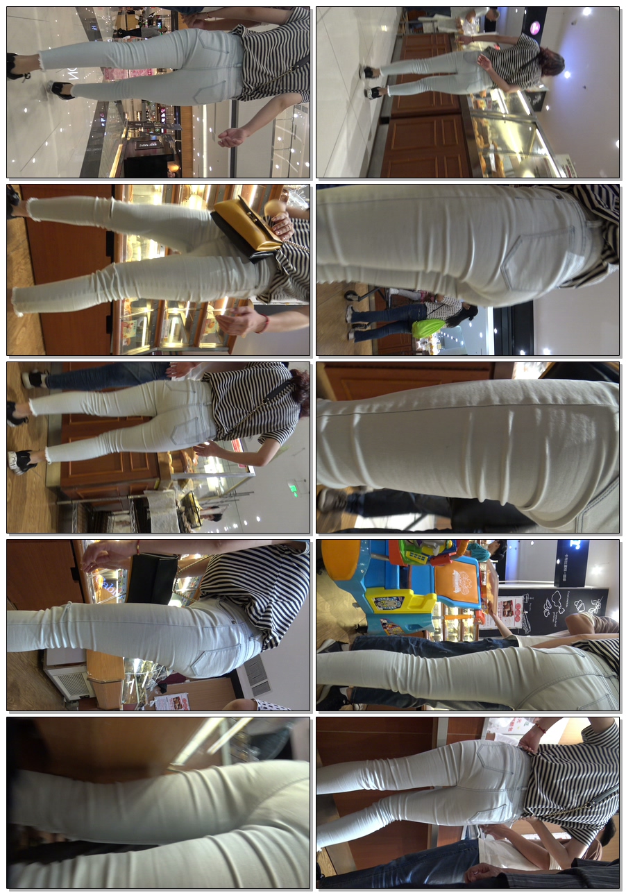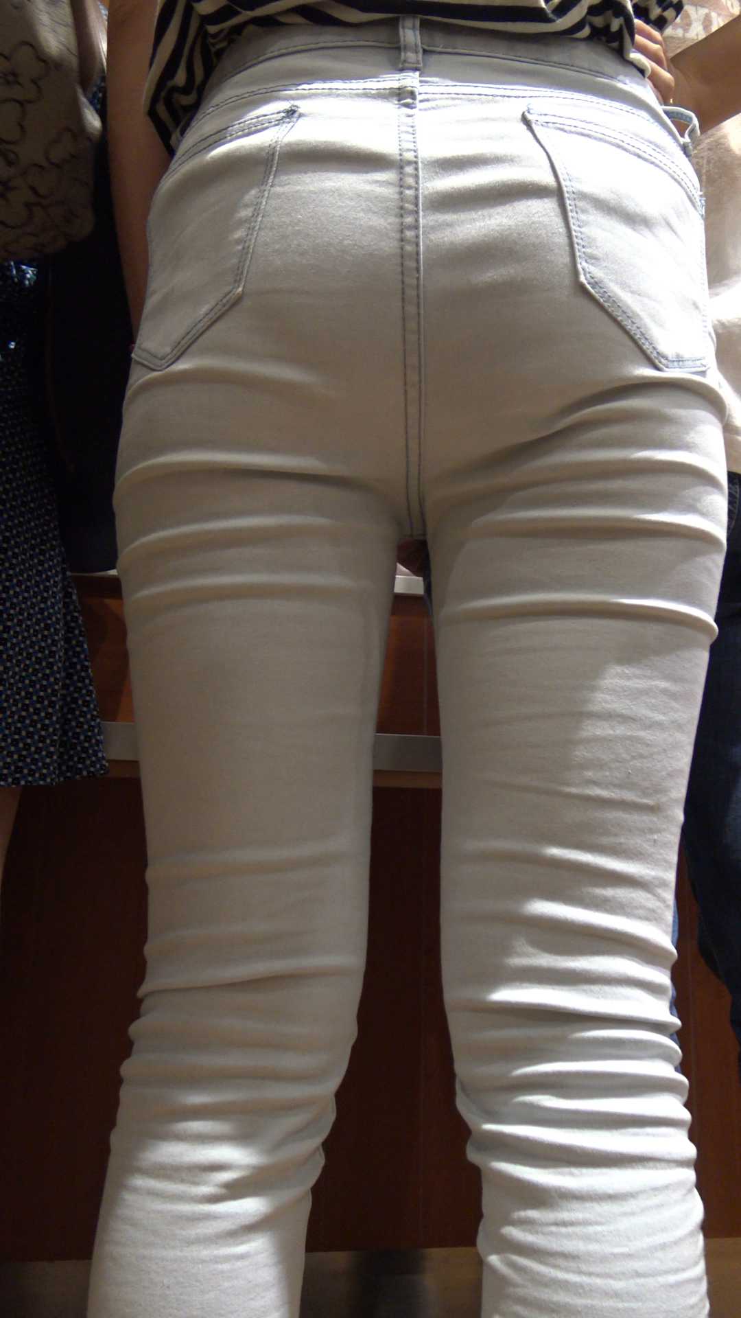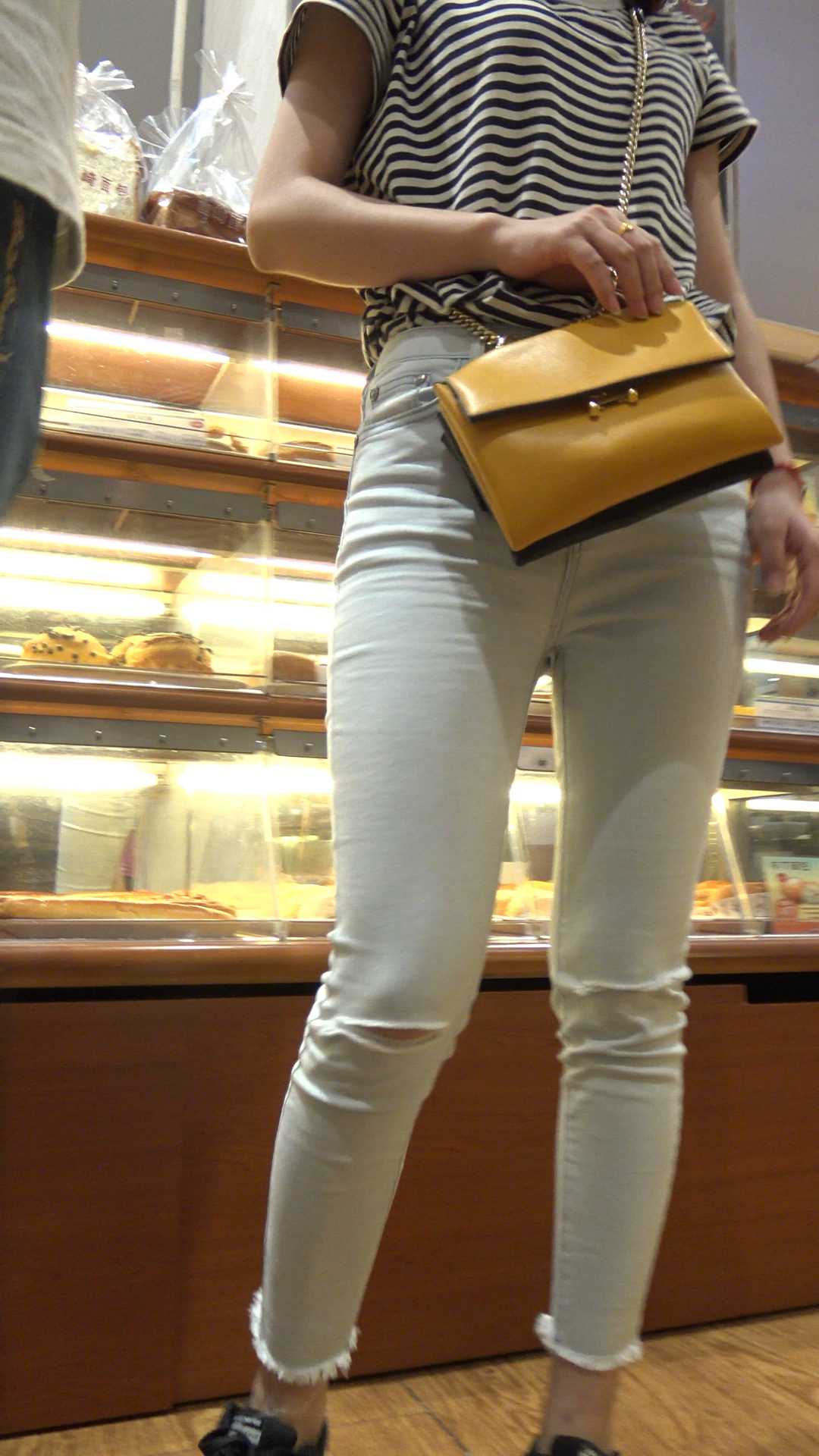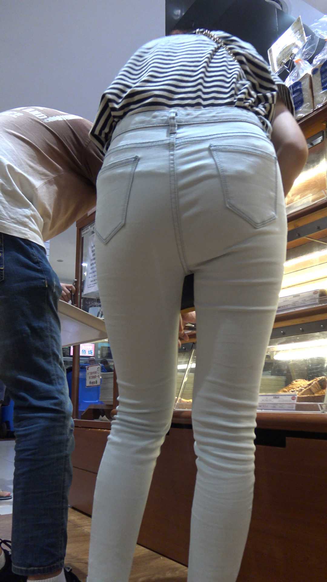 | C414包臀白牛仔裤弯腰露翘臀 |