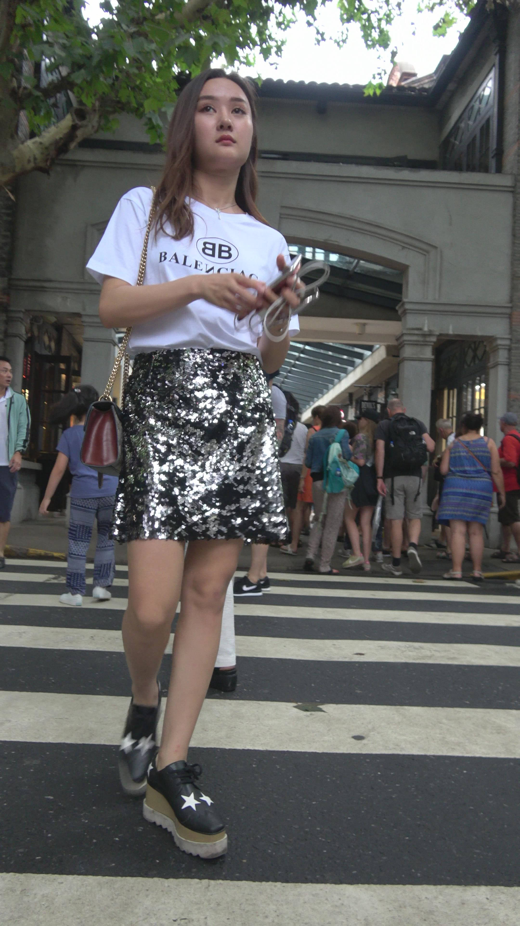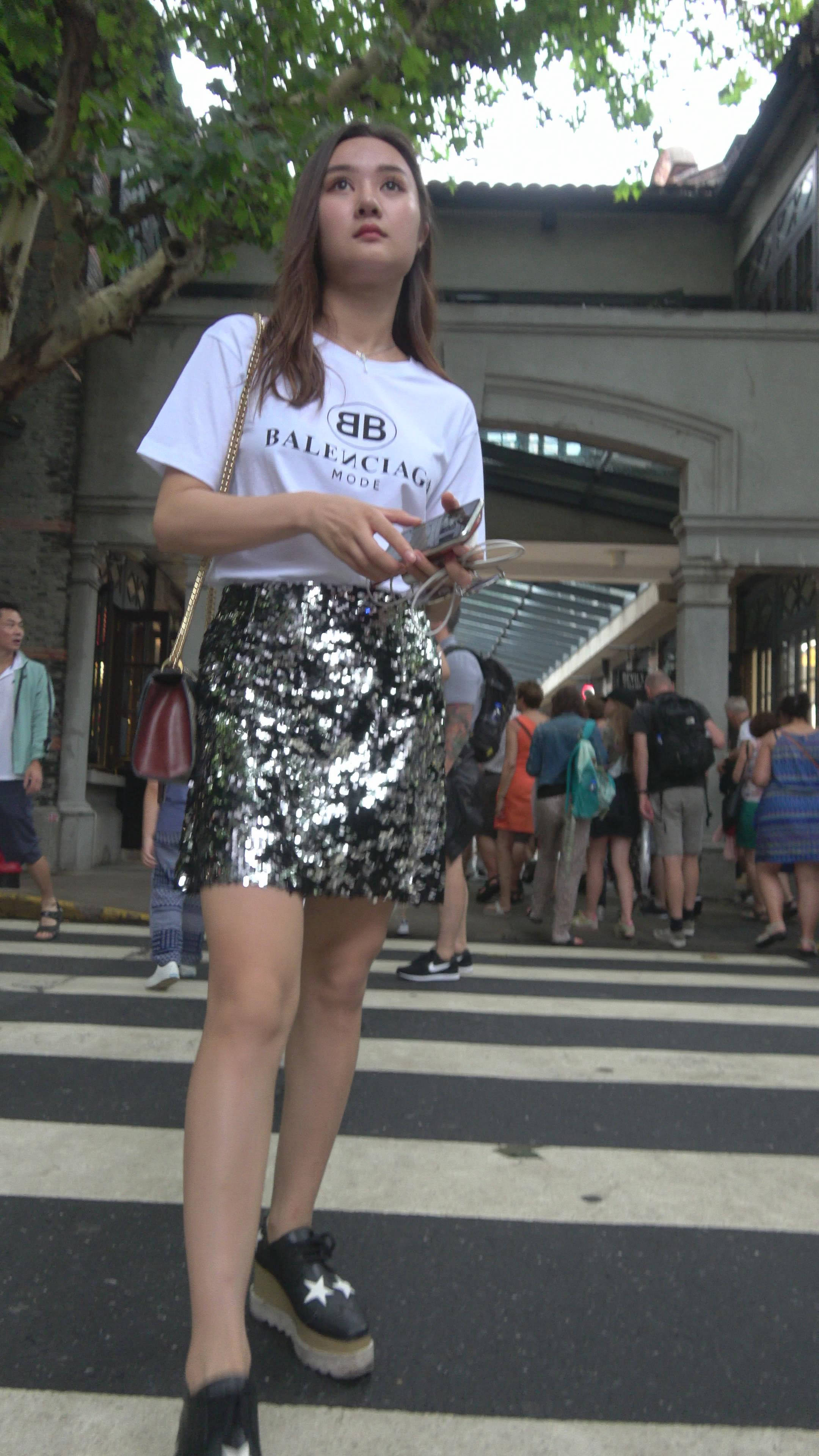 | 4K 闪闪发亮短裙白T恤街拍美女 编号7323 |