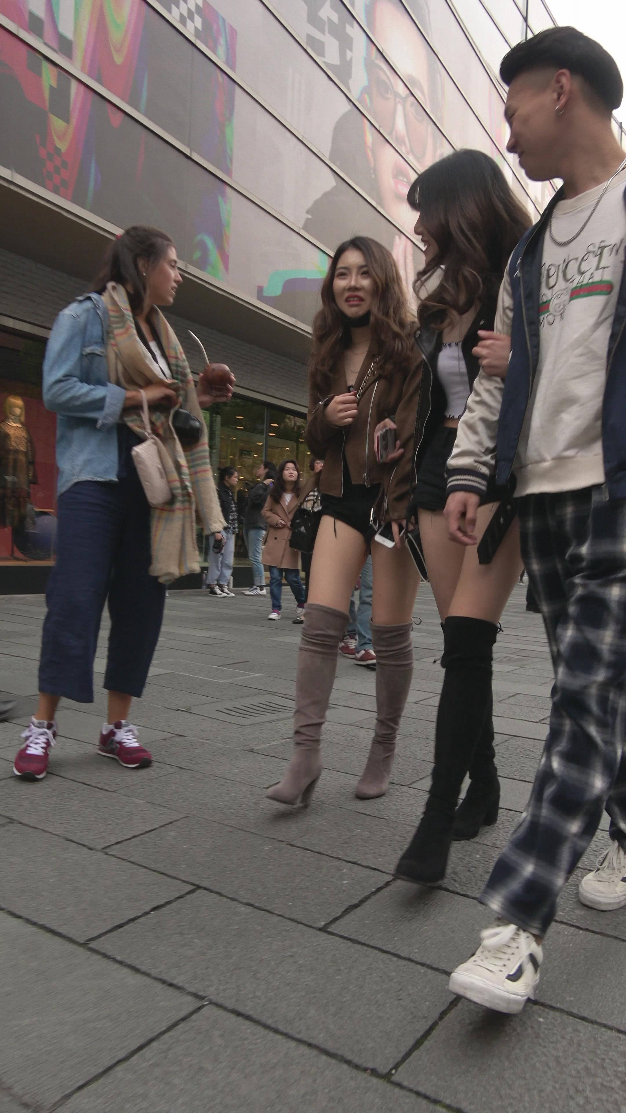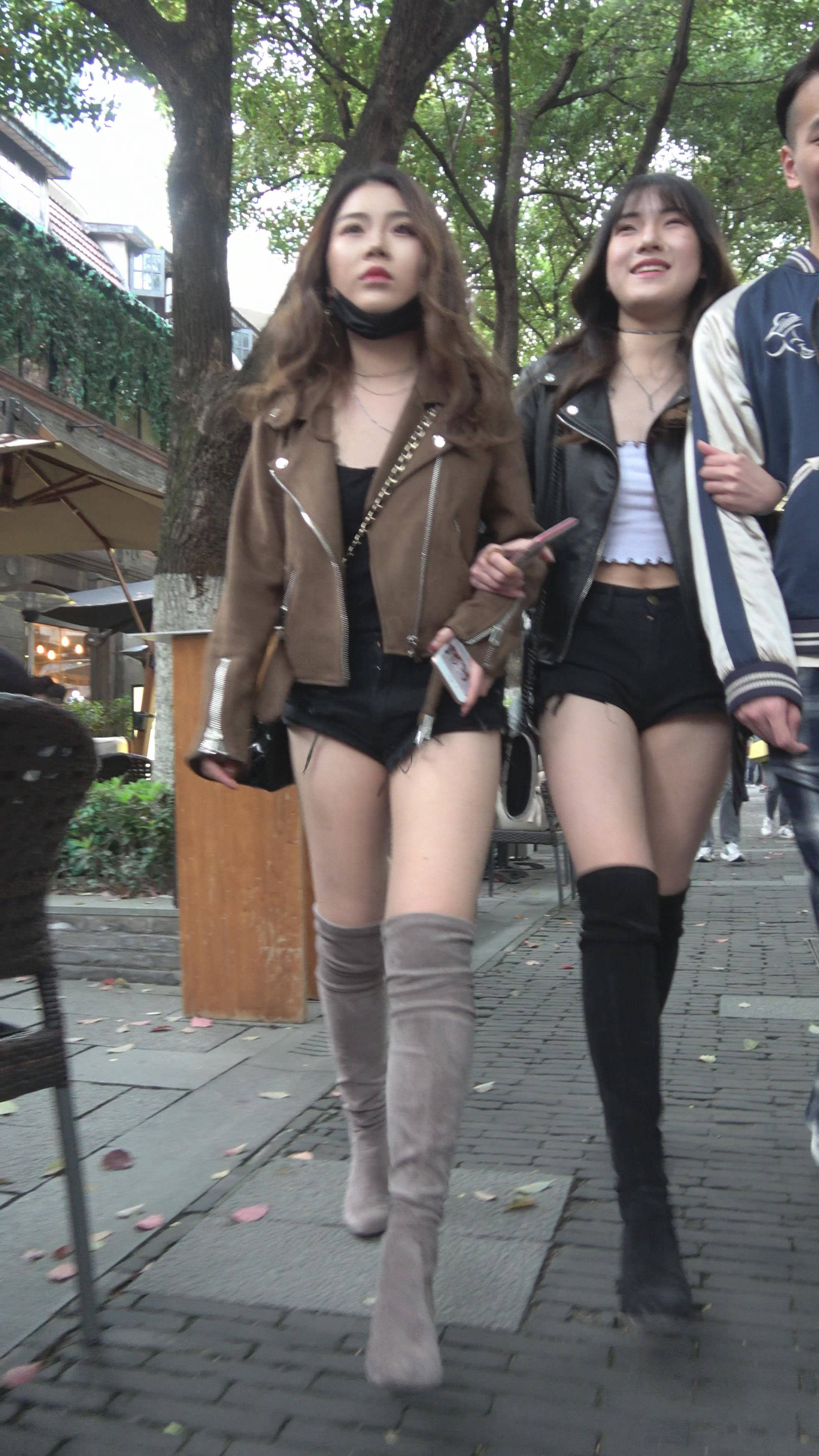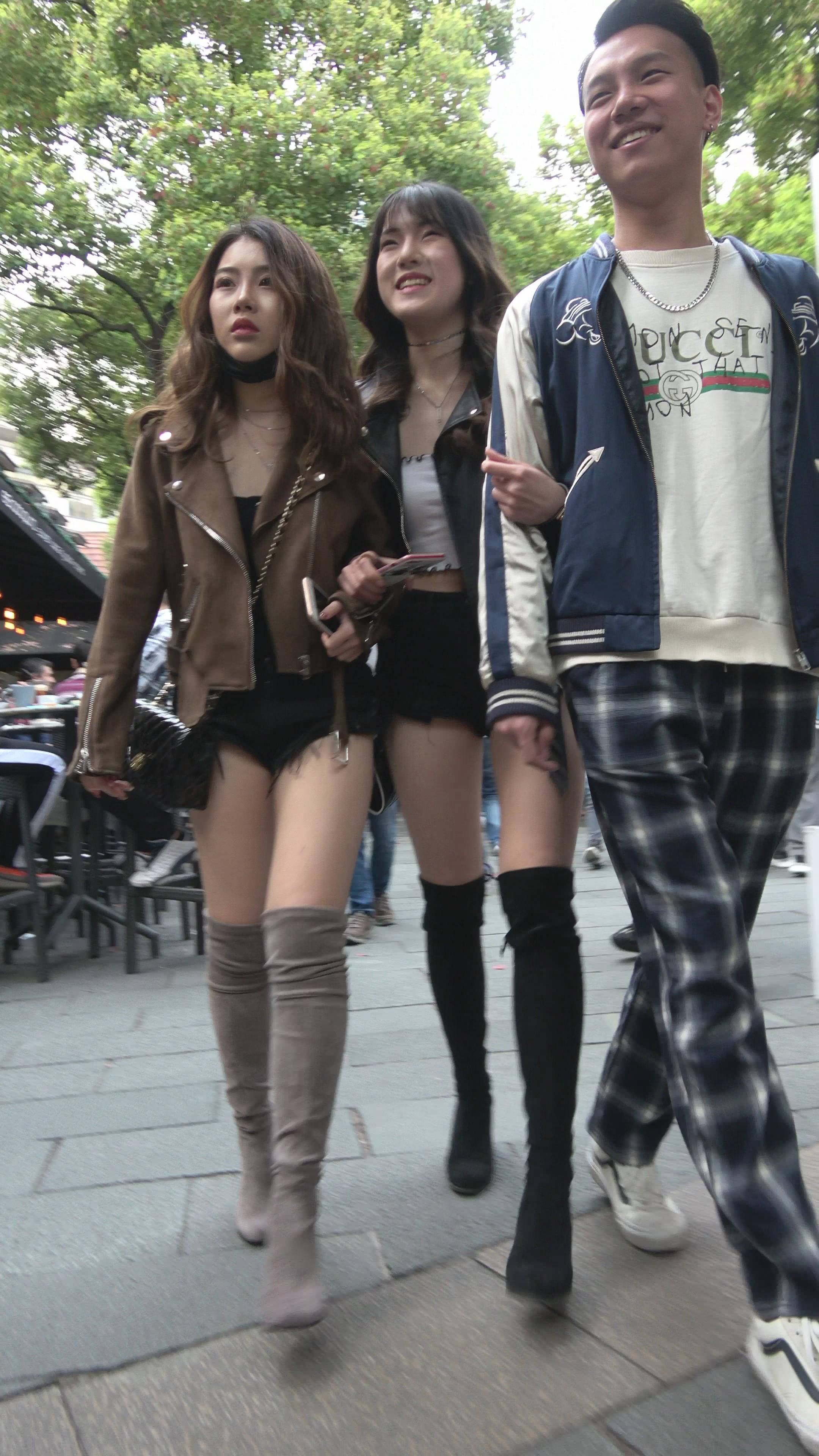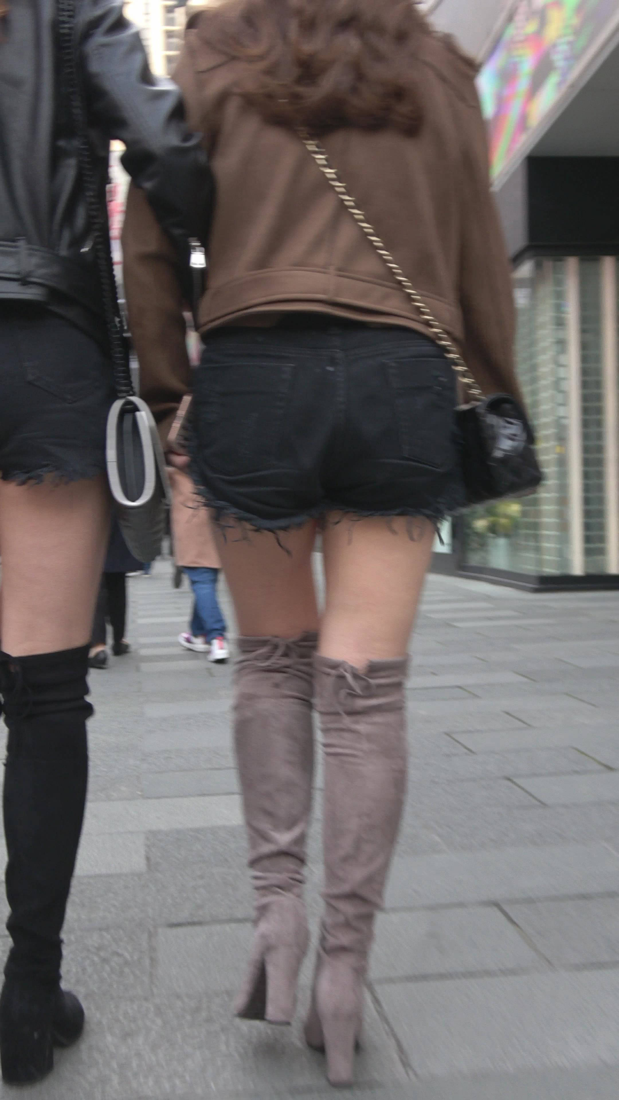 | 4K - 黑色口罩长筒靴超短热裤街拍美腿美女姐妹 编号7728 |