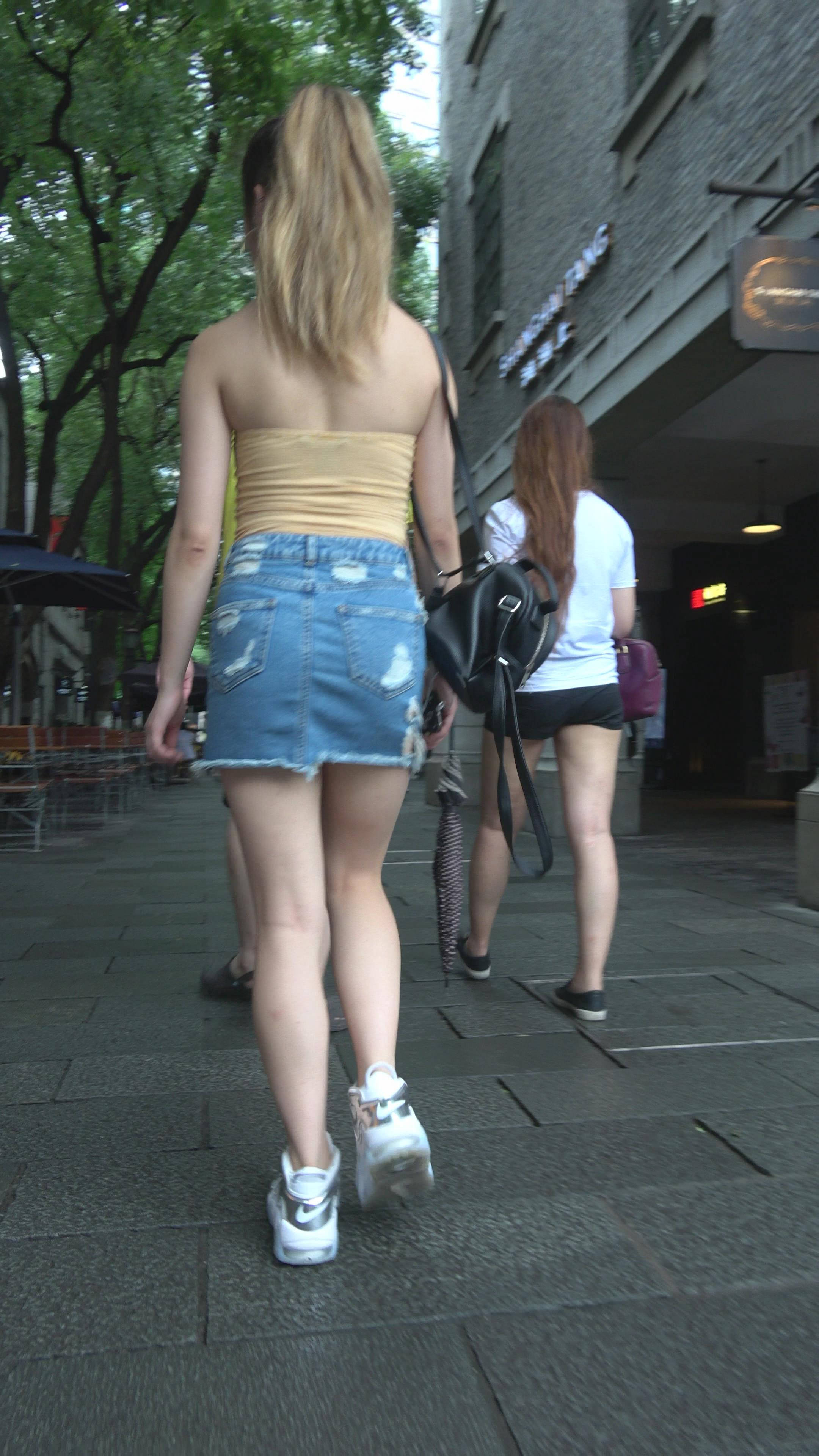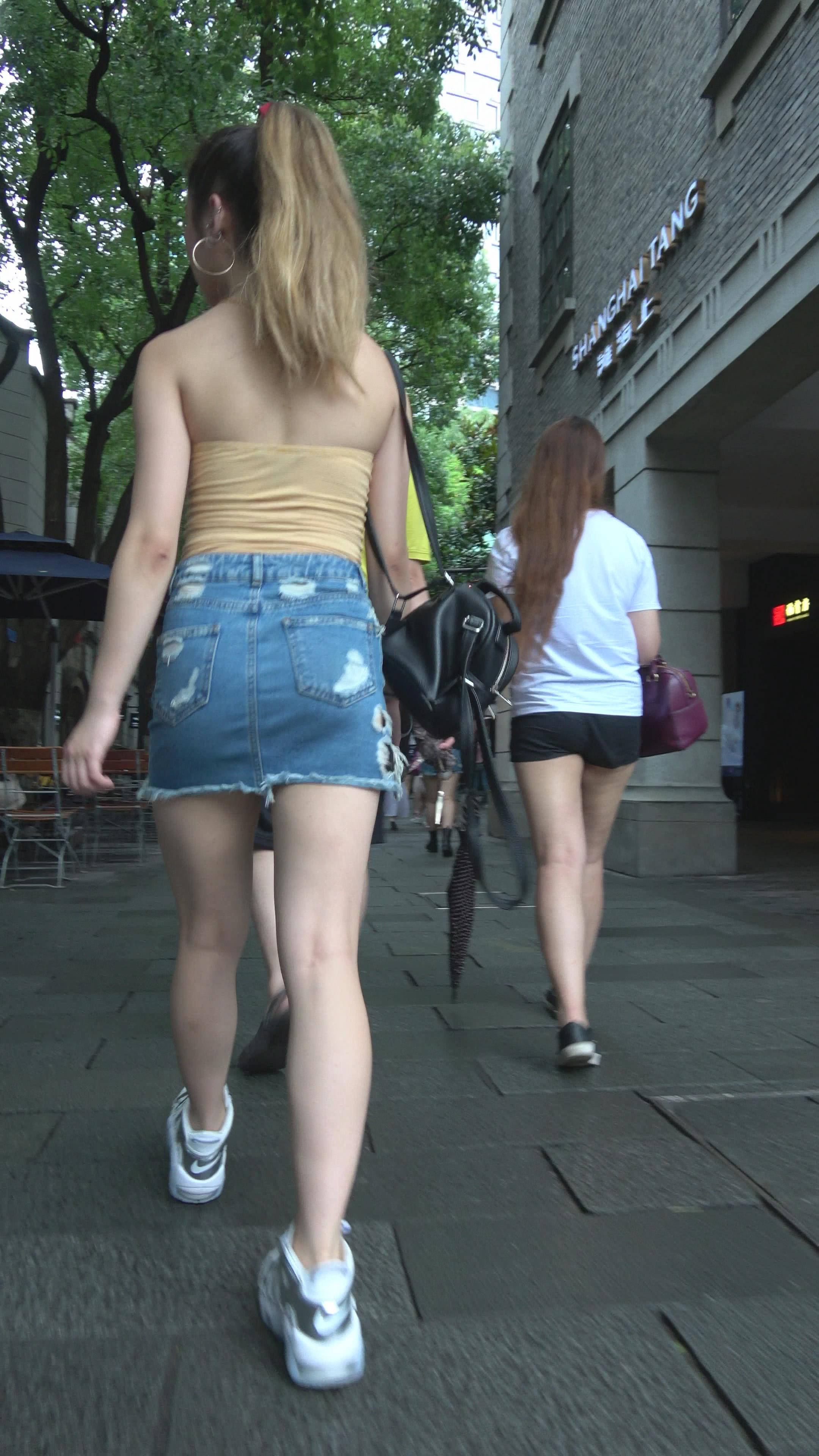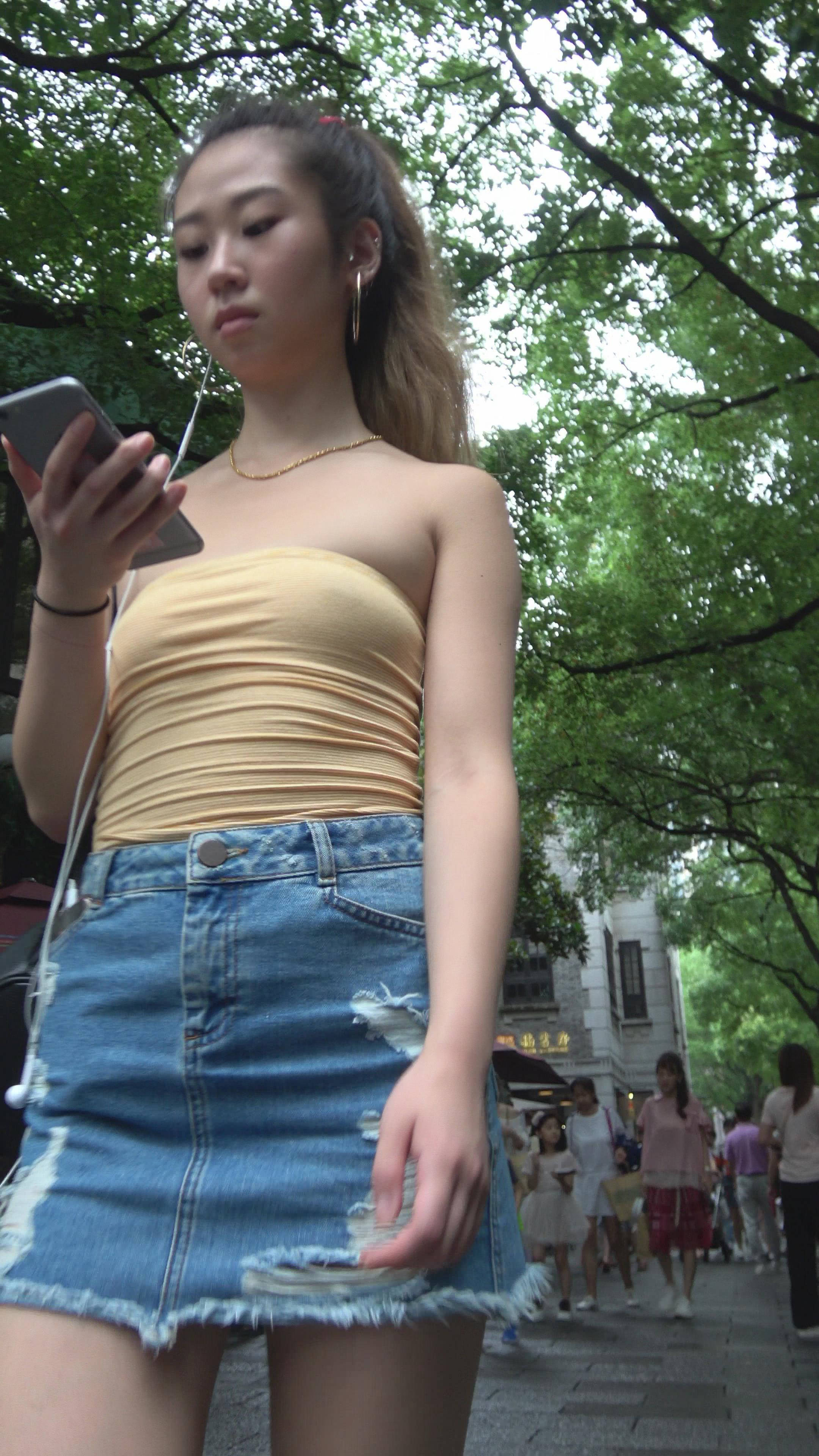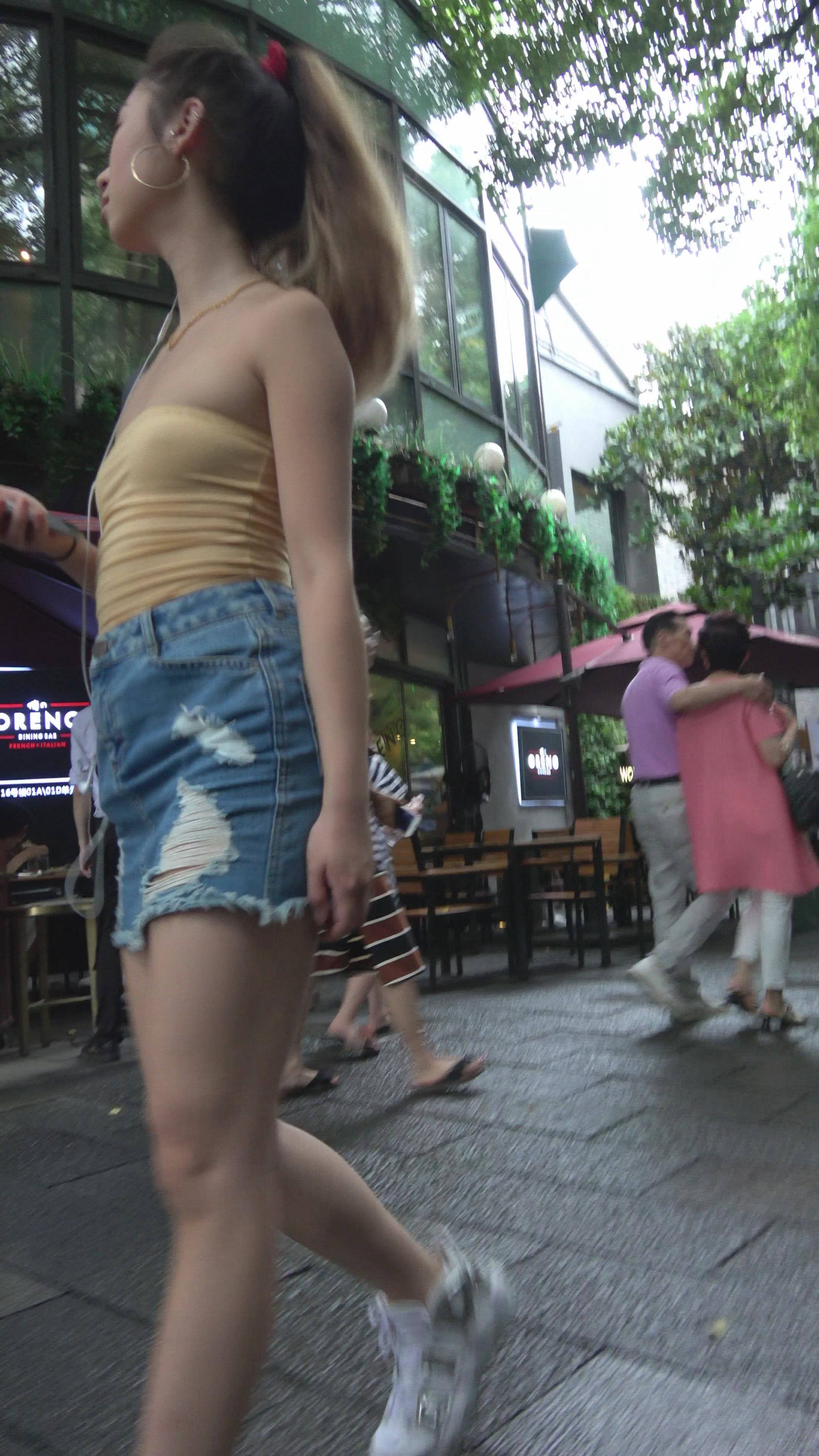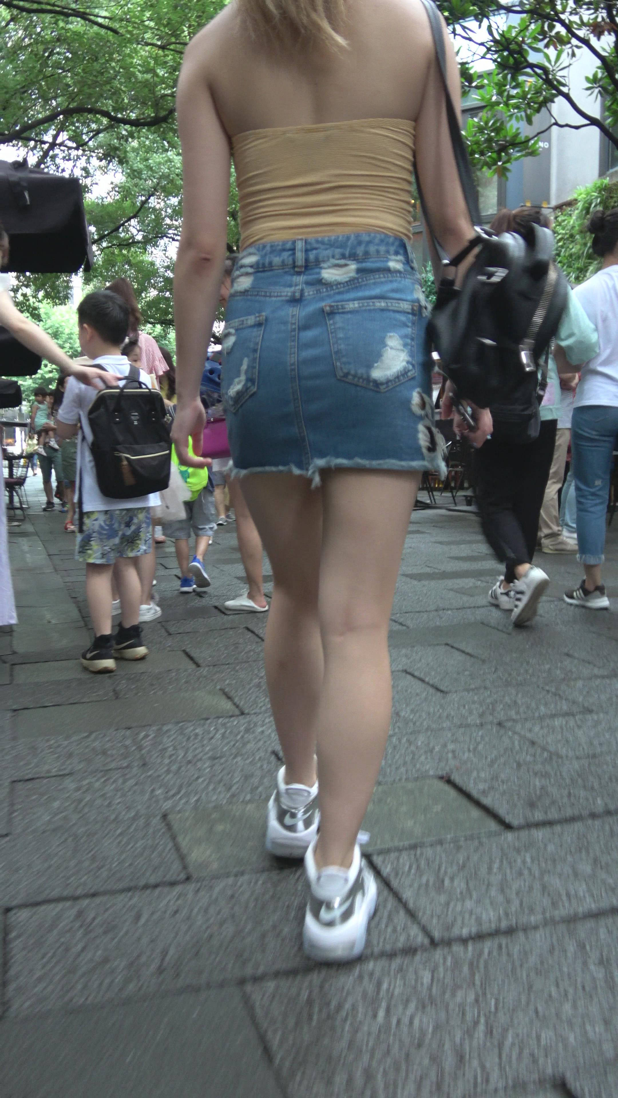 | 4K 黄色小抹胸牛仔裙街拍美腿美女 编号7899 |