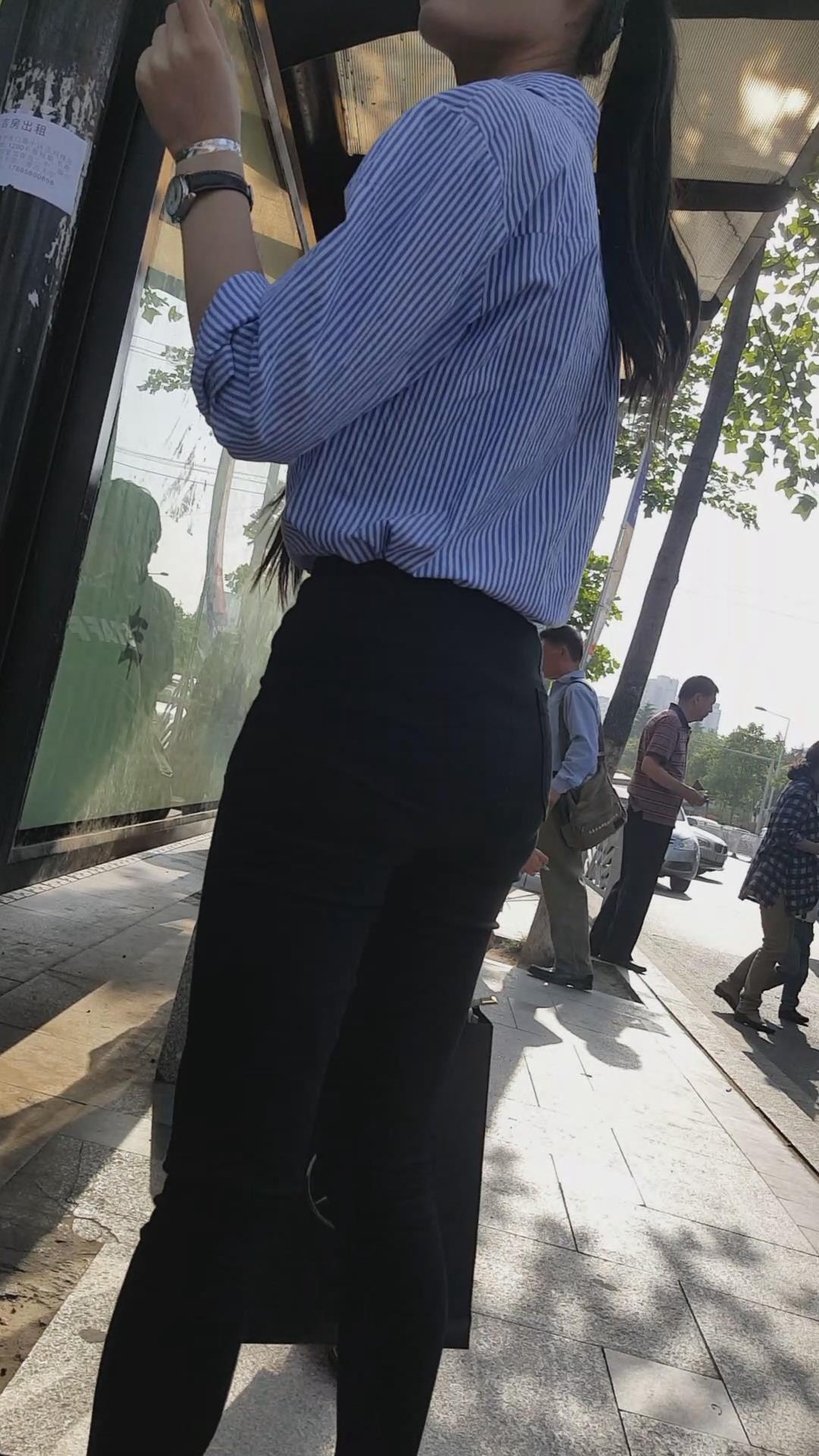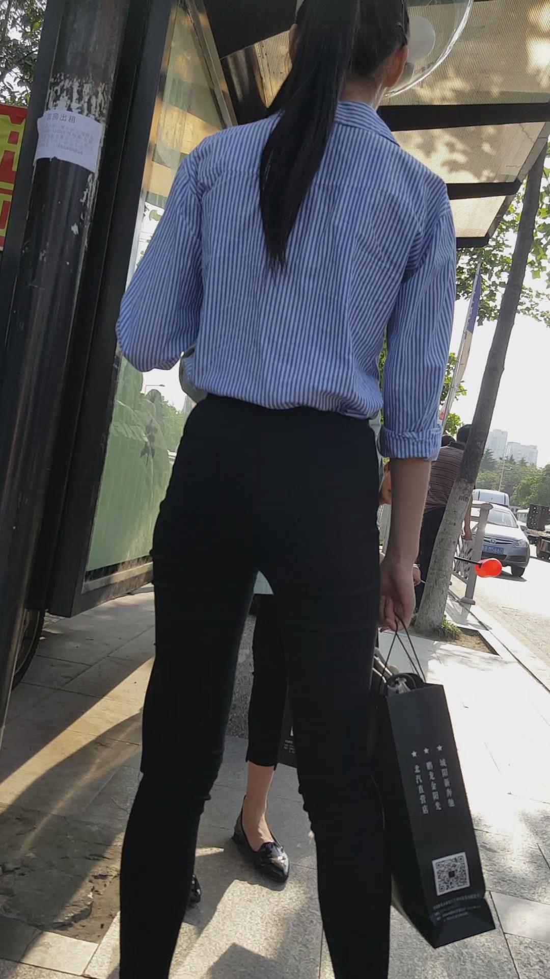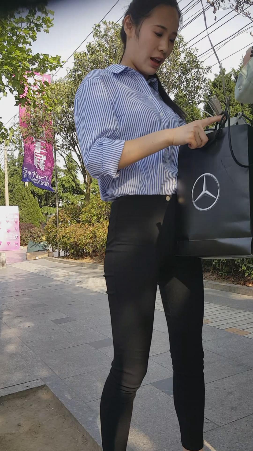 | 清新脱俗黑色紧身裤蓝衬衫美女编号3923 |