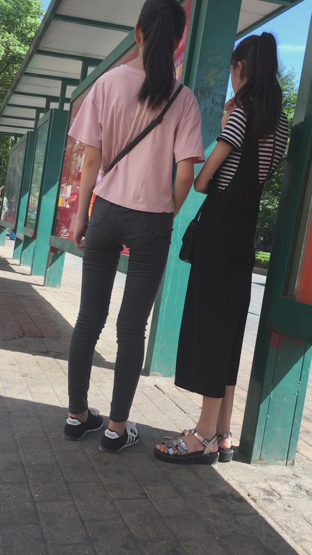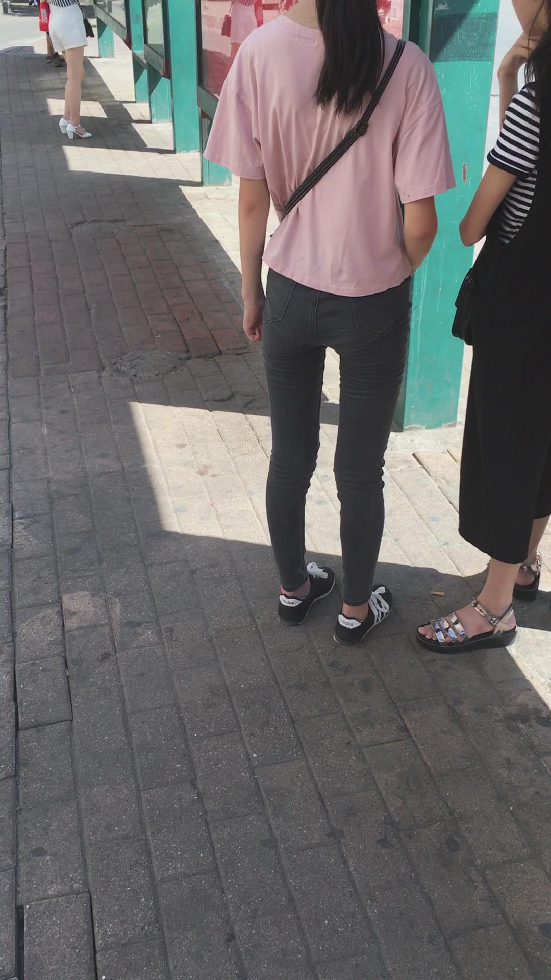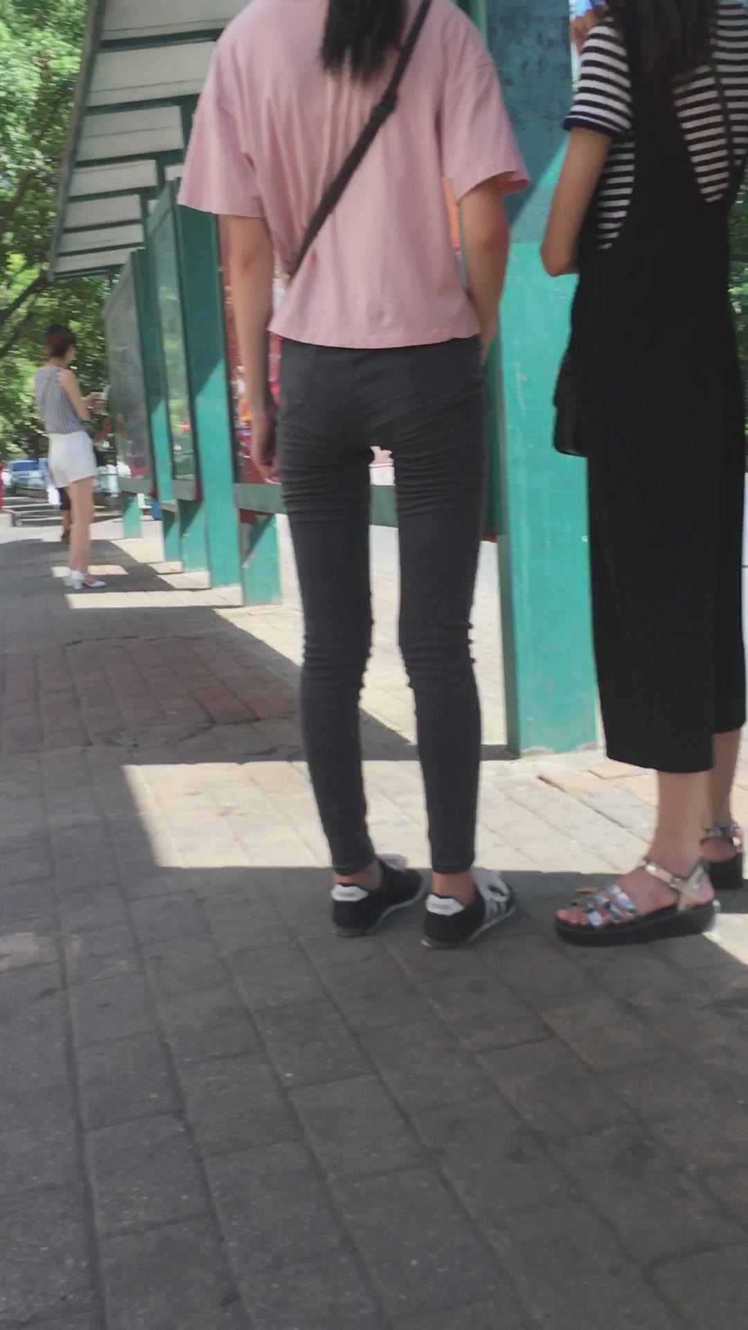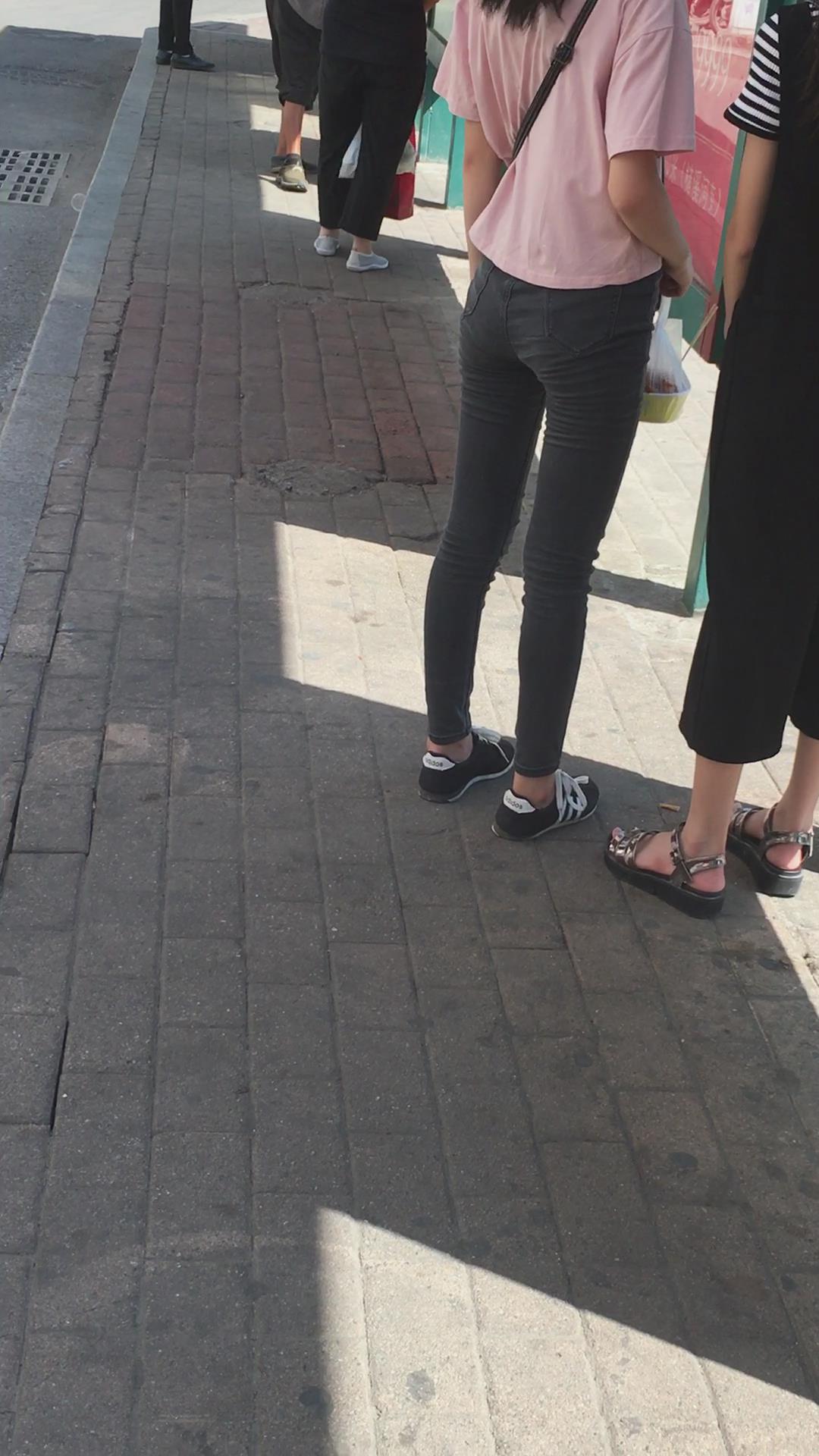 | 粉色T恤黑色牛仔裤小美女在等公交车 编号6073 |