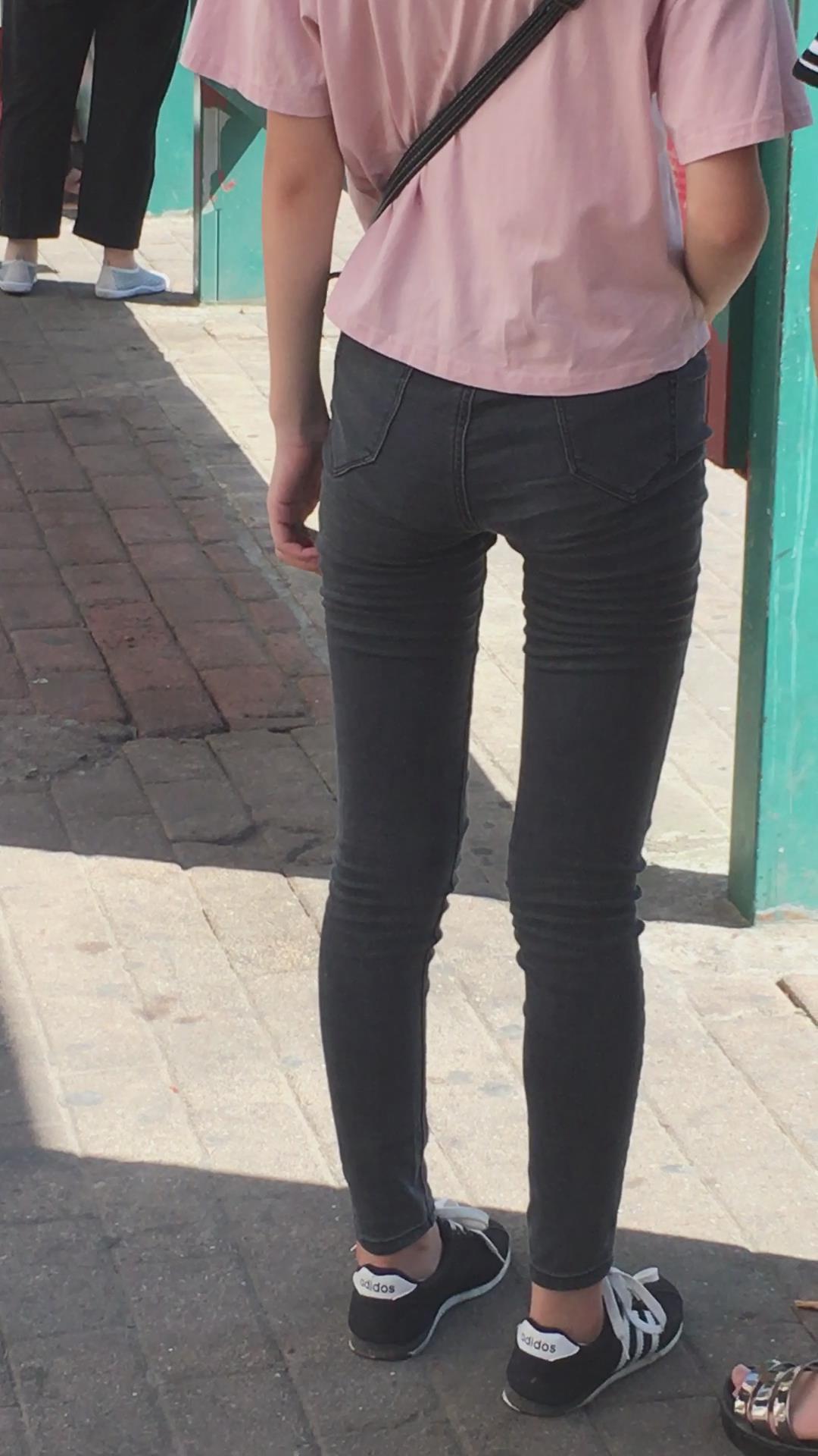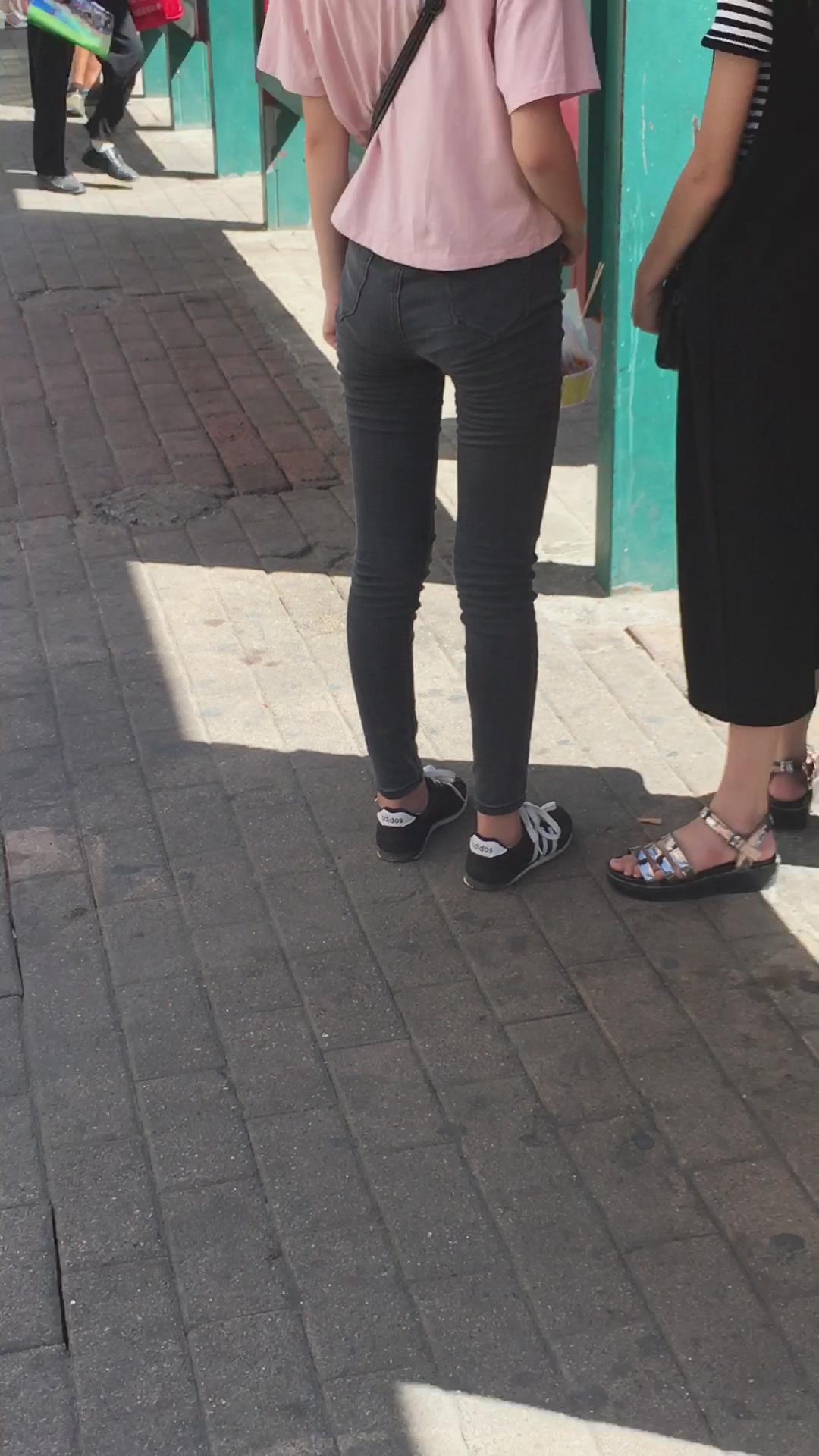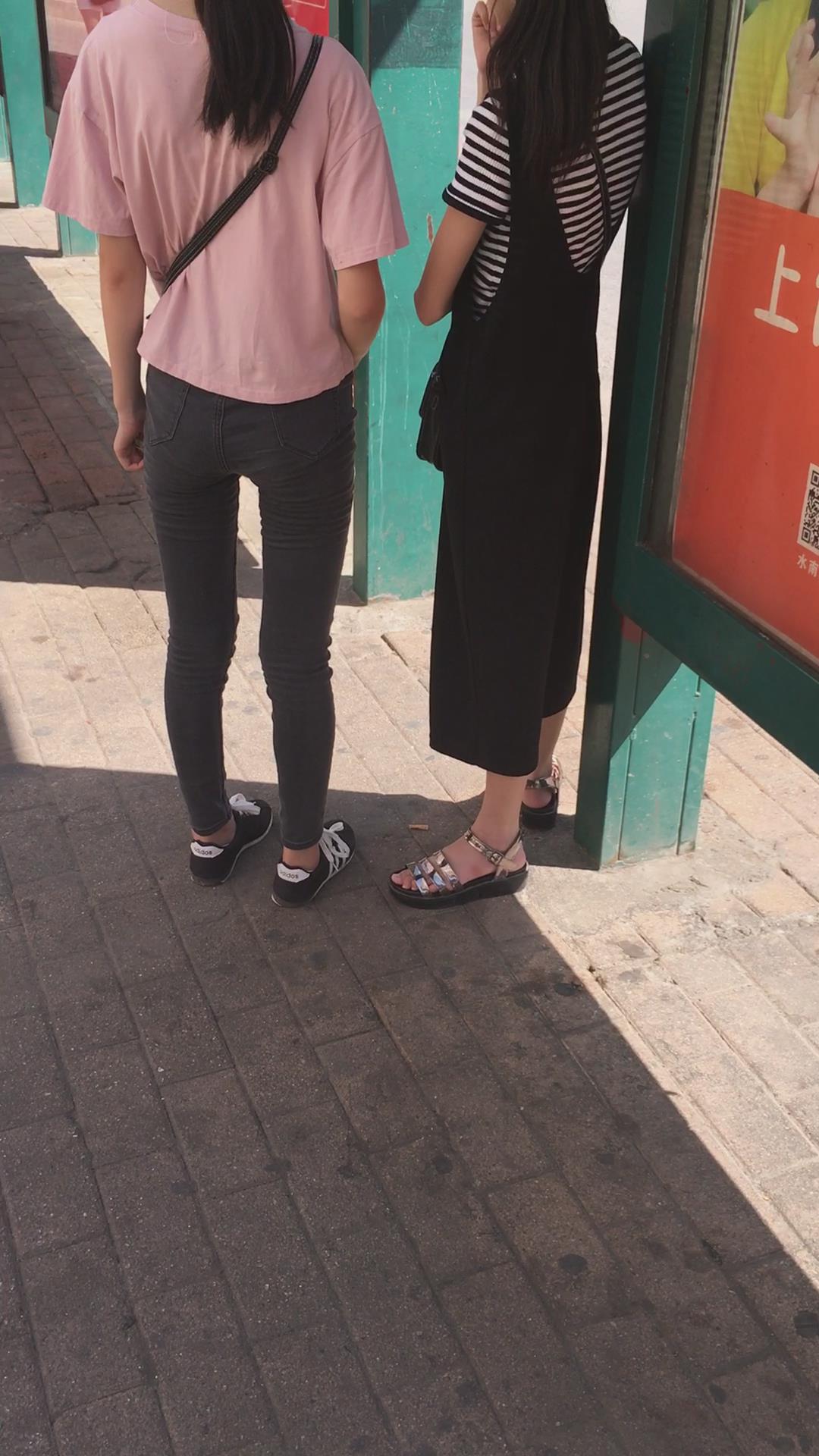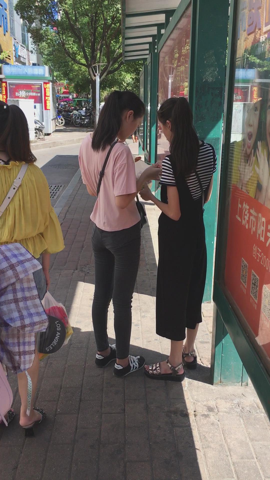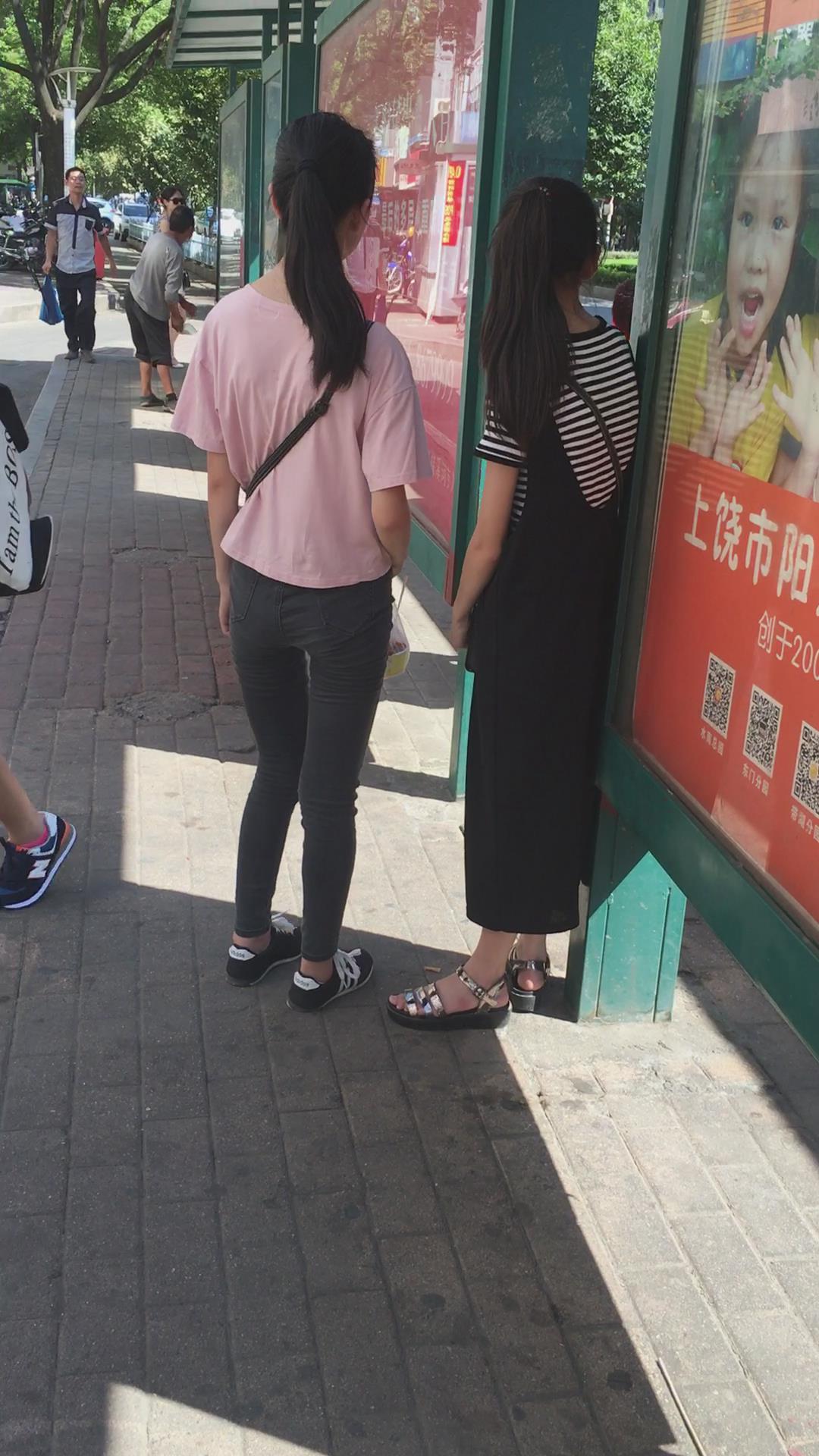 | 粉色T恤黑色牛仔裤小美女在等公交车 编号6073 |