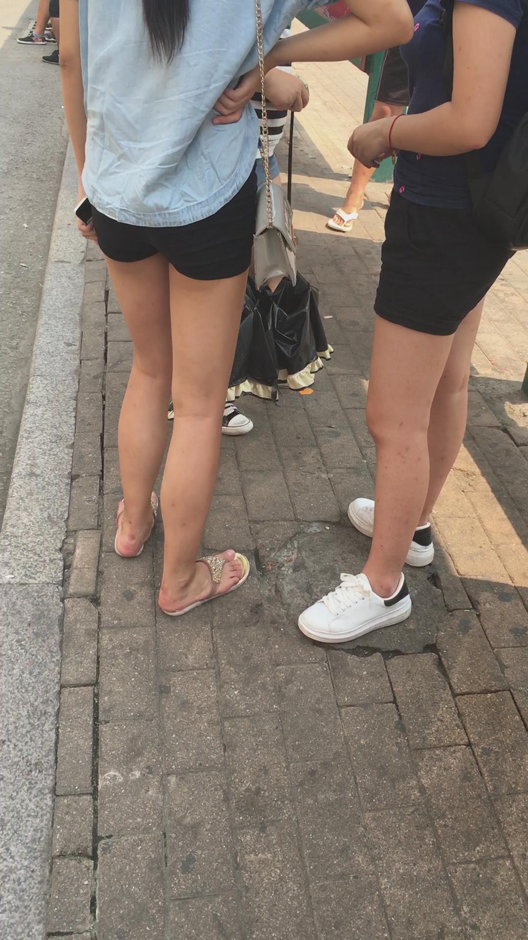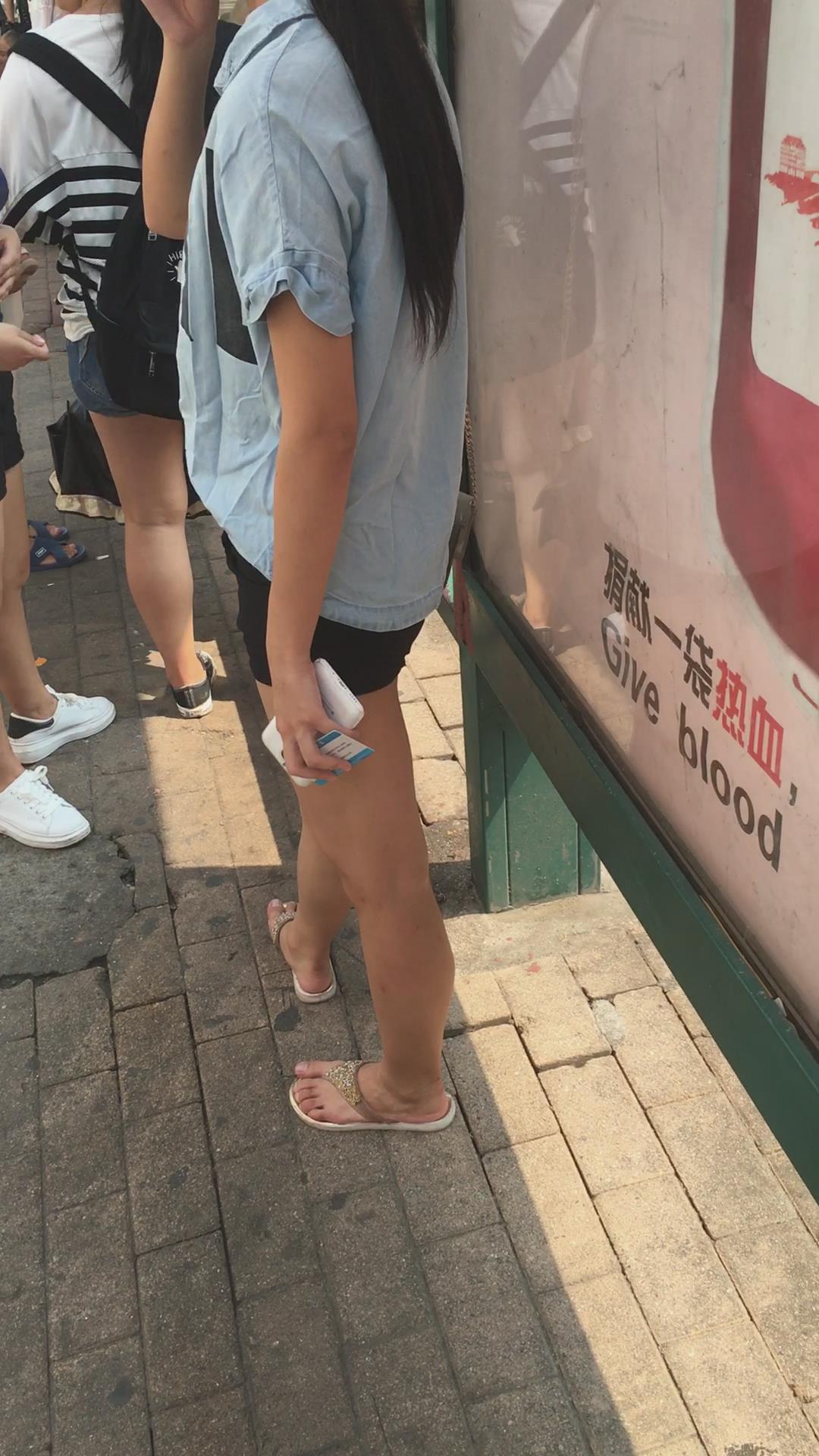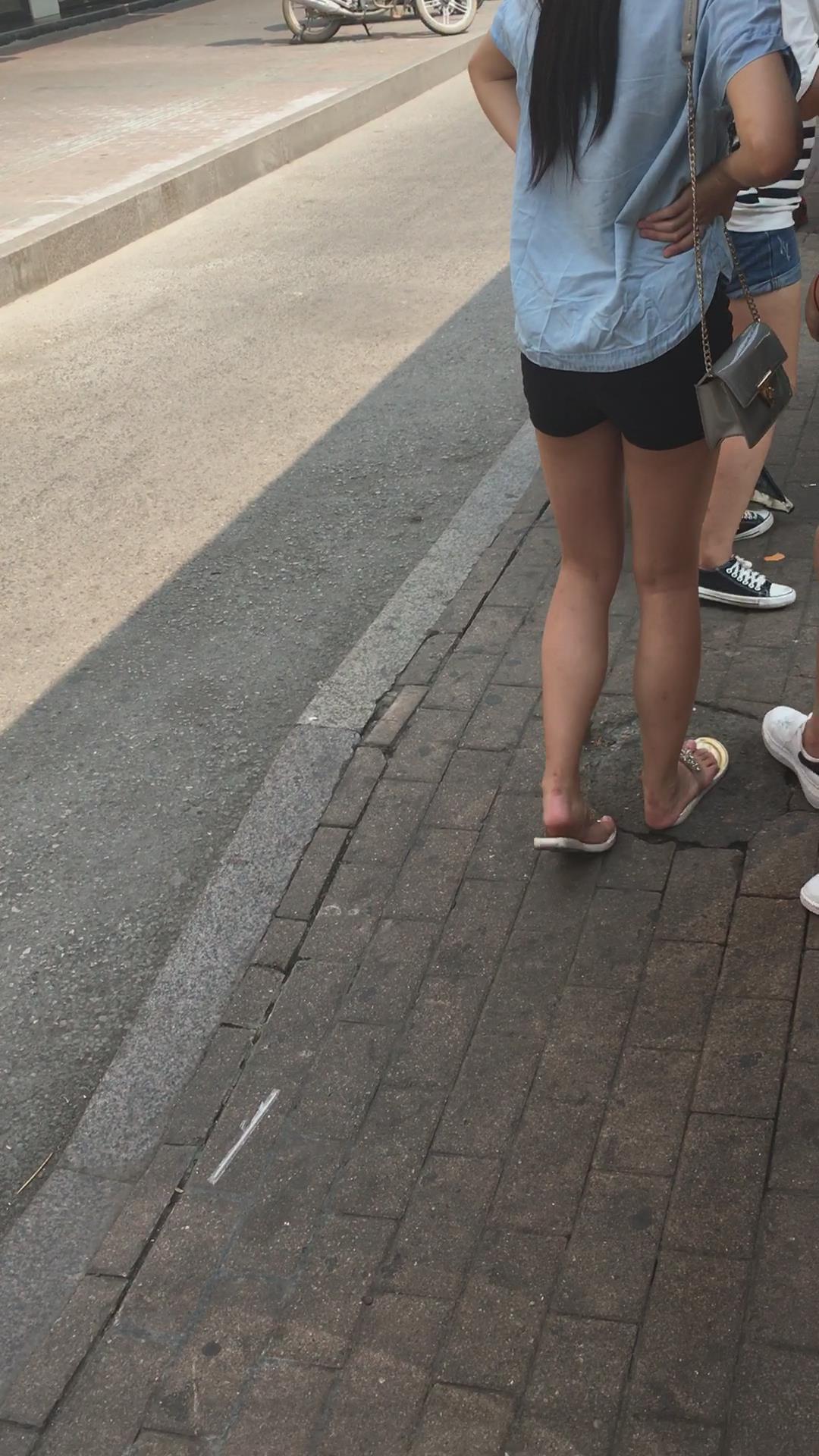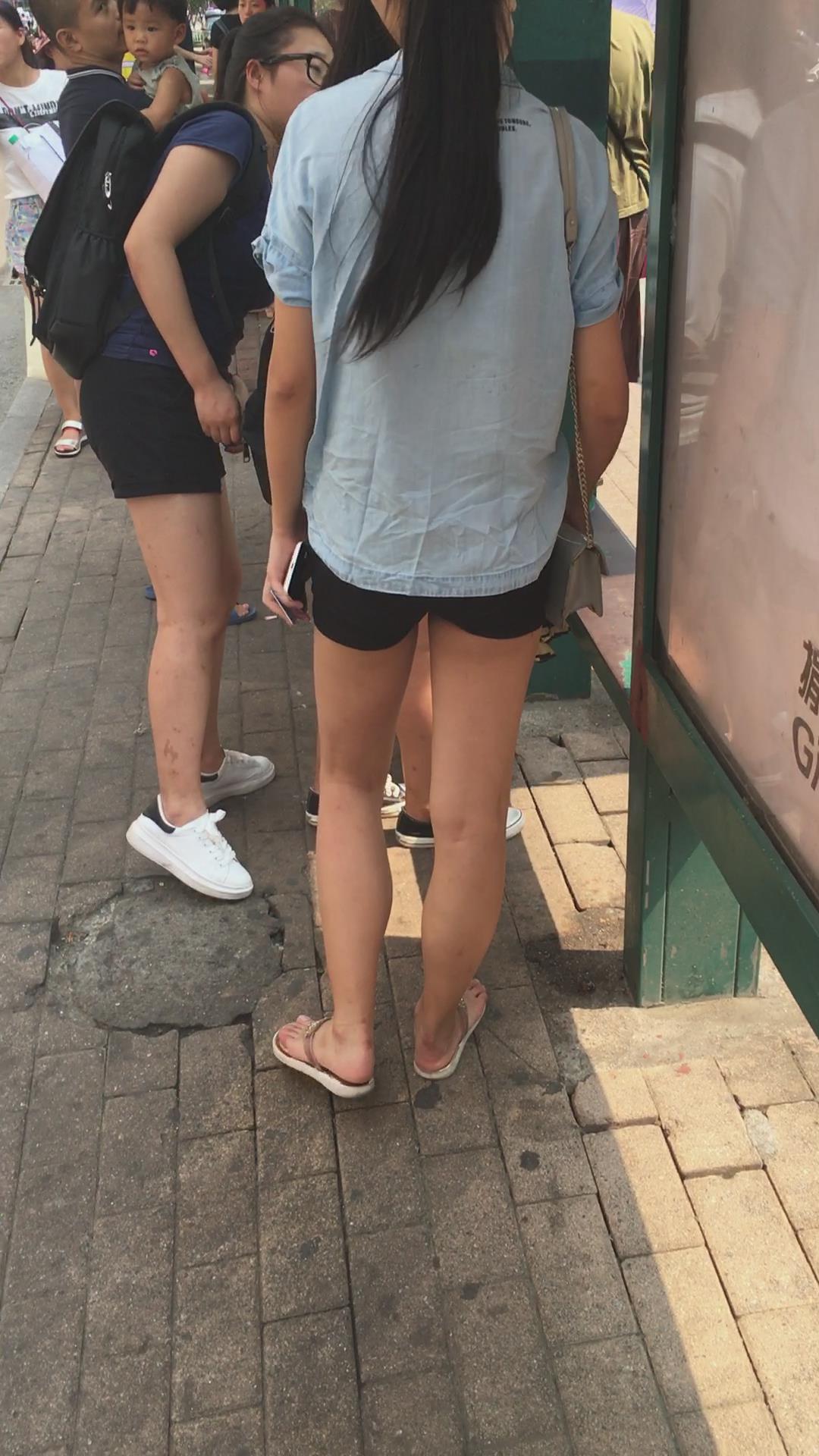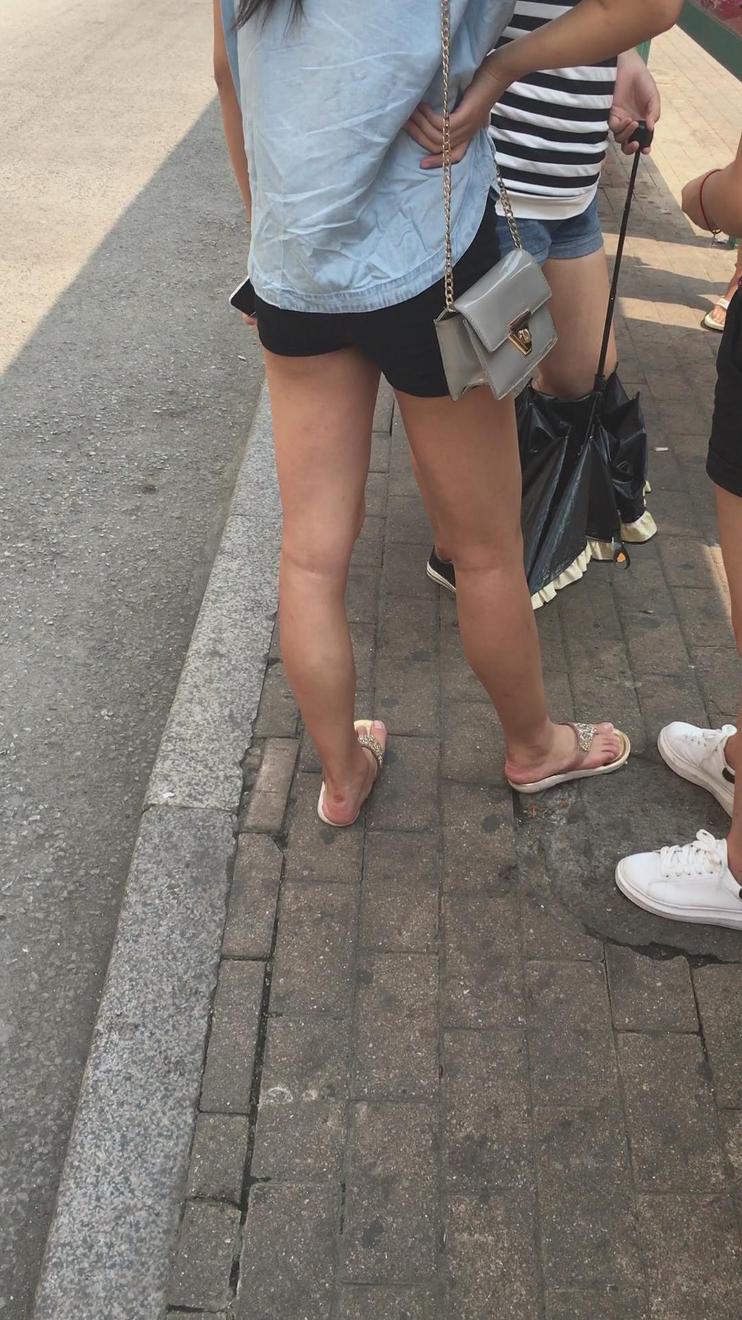 | 黑色短裤浅蓝T恤衫长马尾辫美女等公交车 编号4489 |