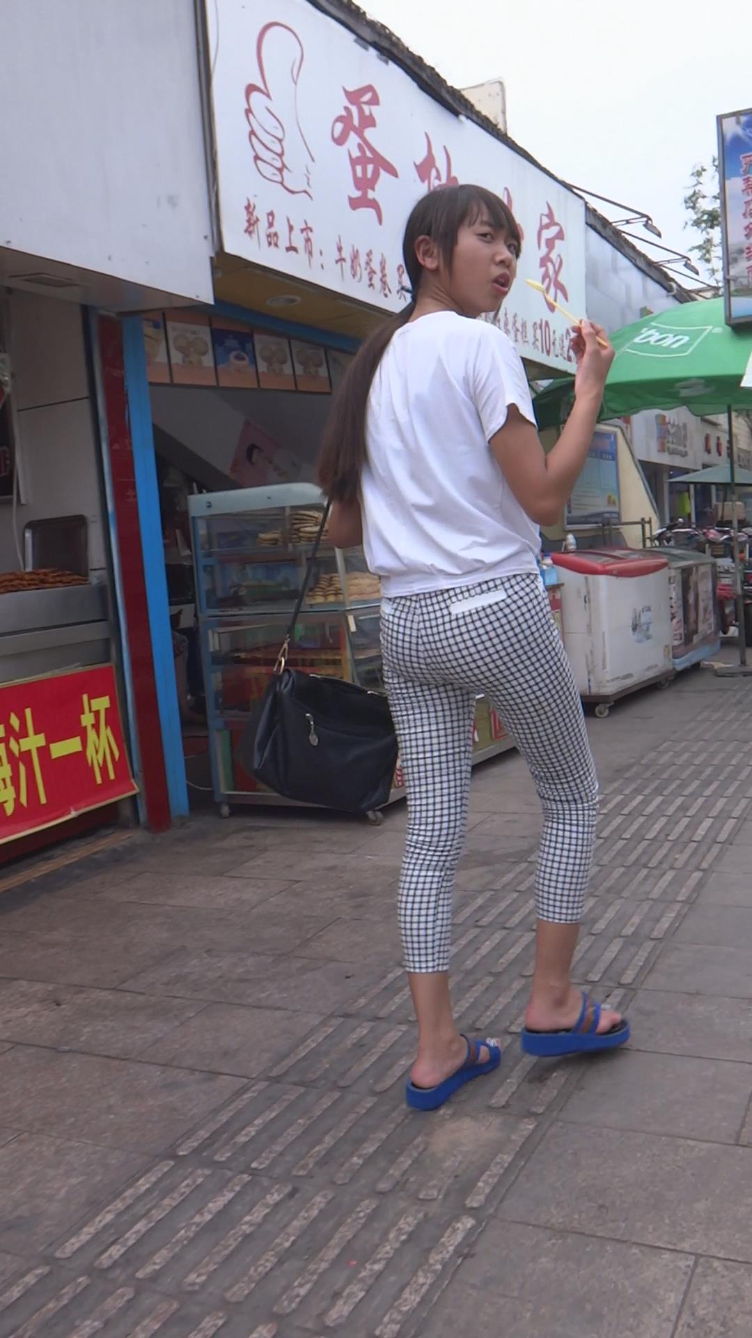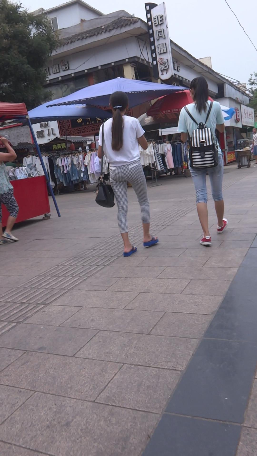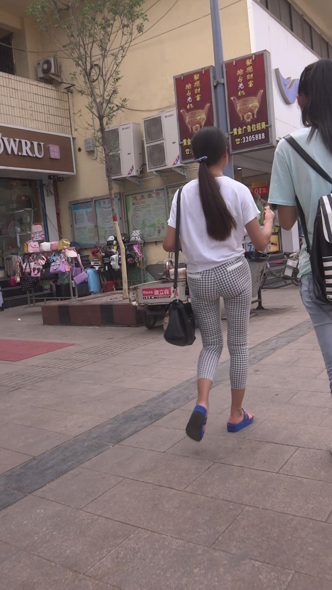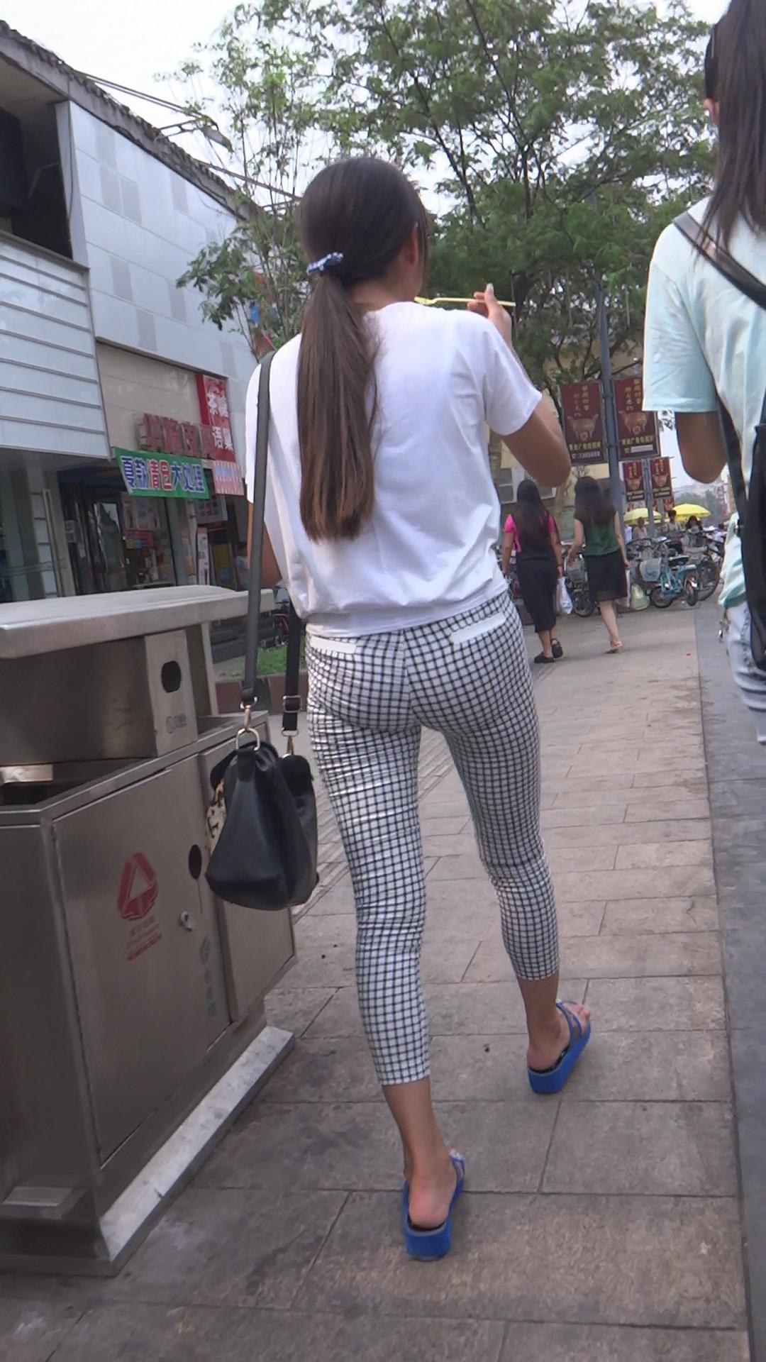 | 街拍的格子七分裤白T恤圆臀女孩。 编号5985 |