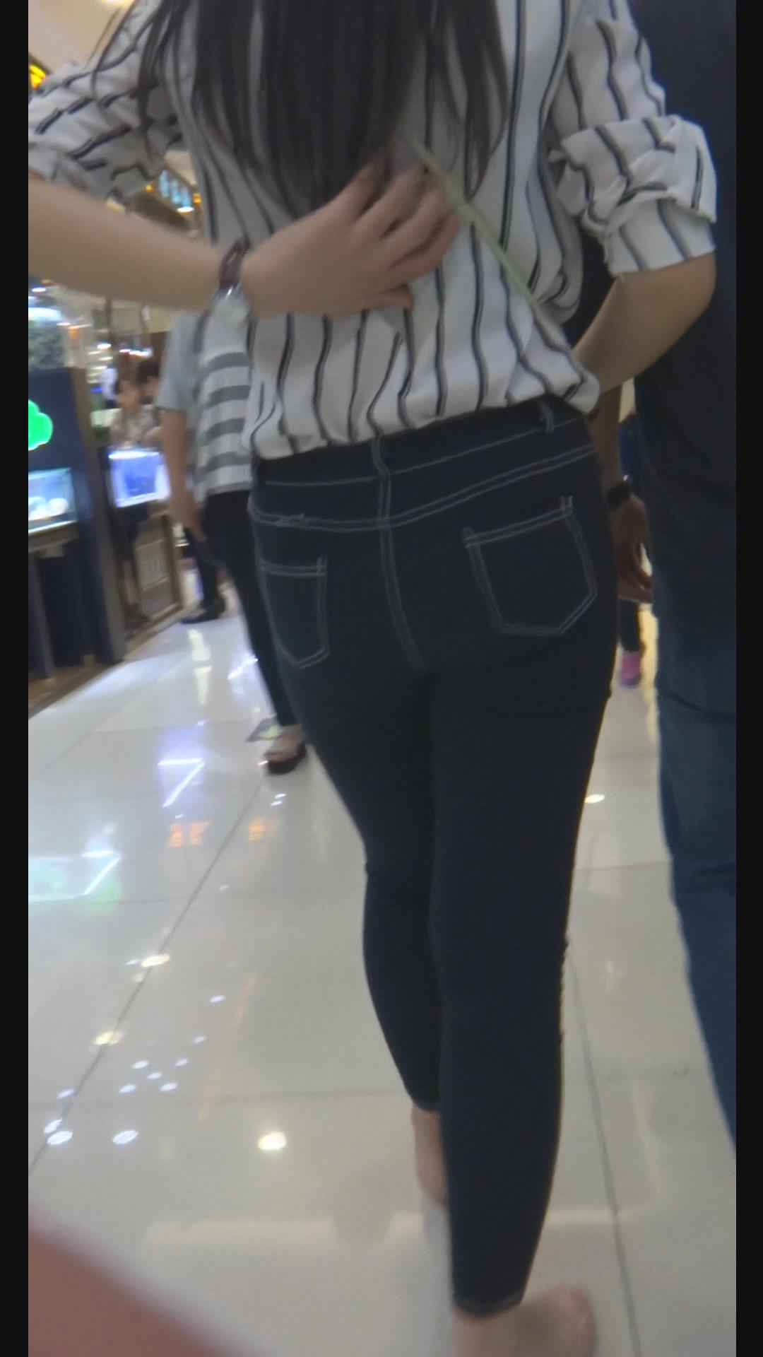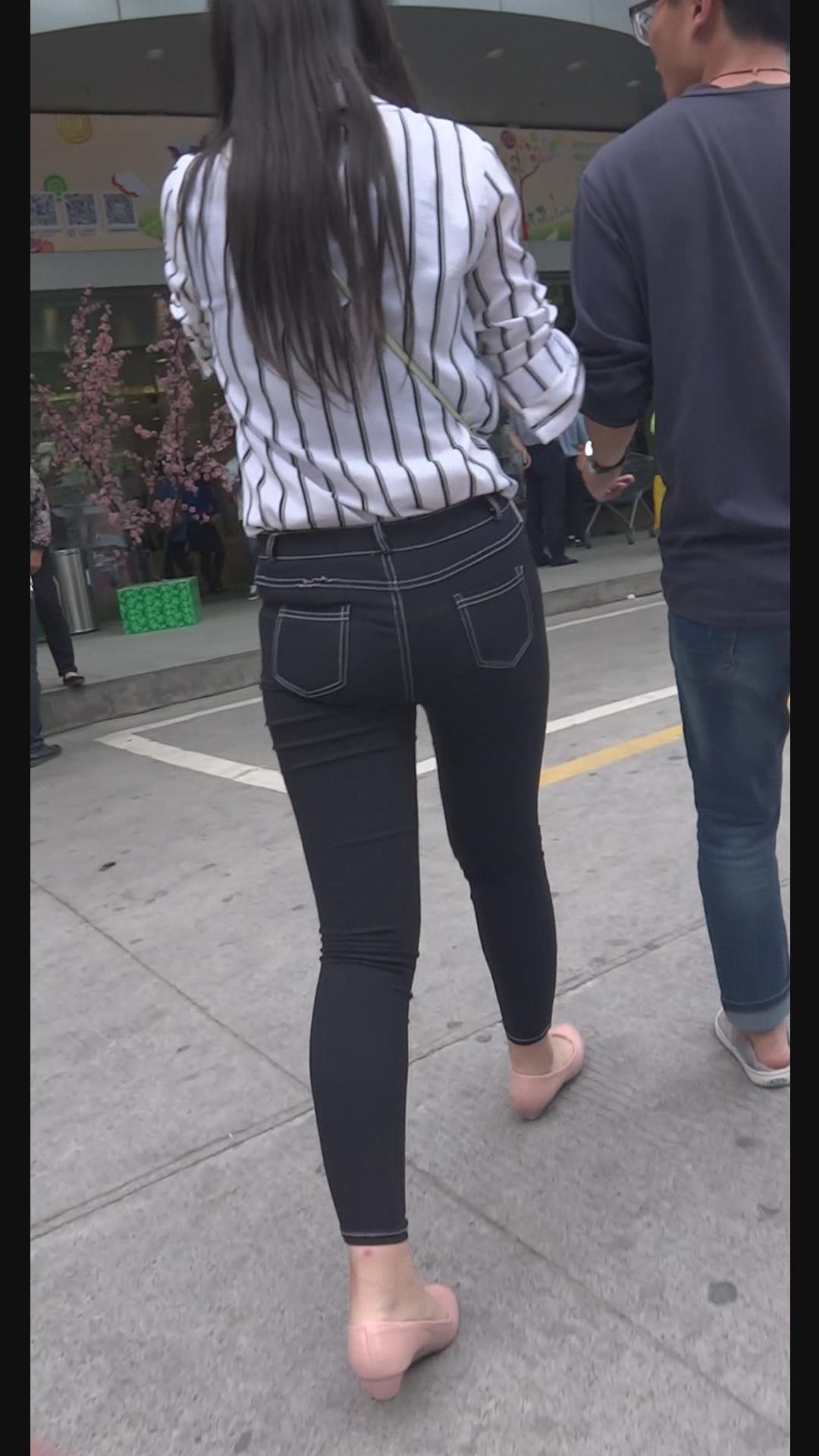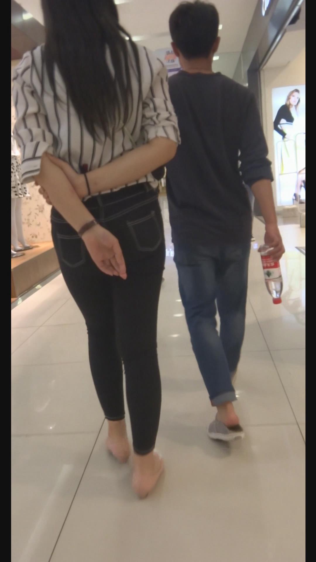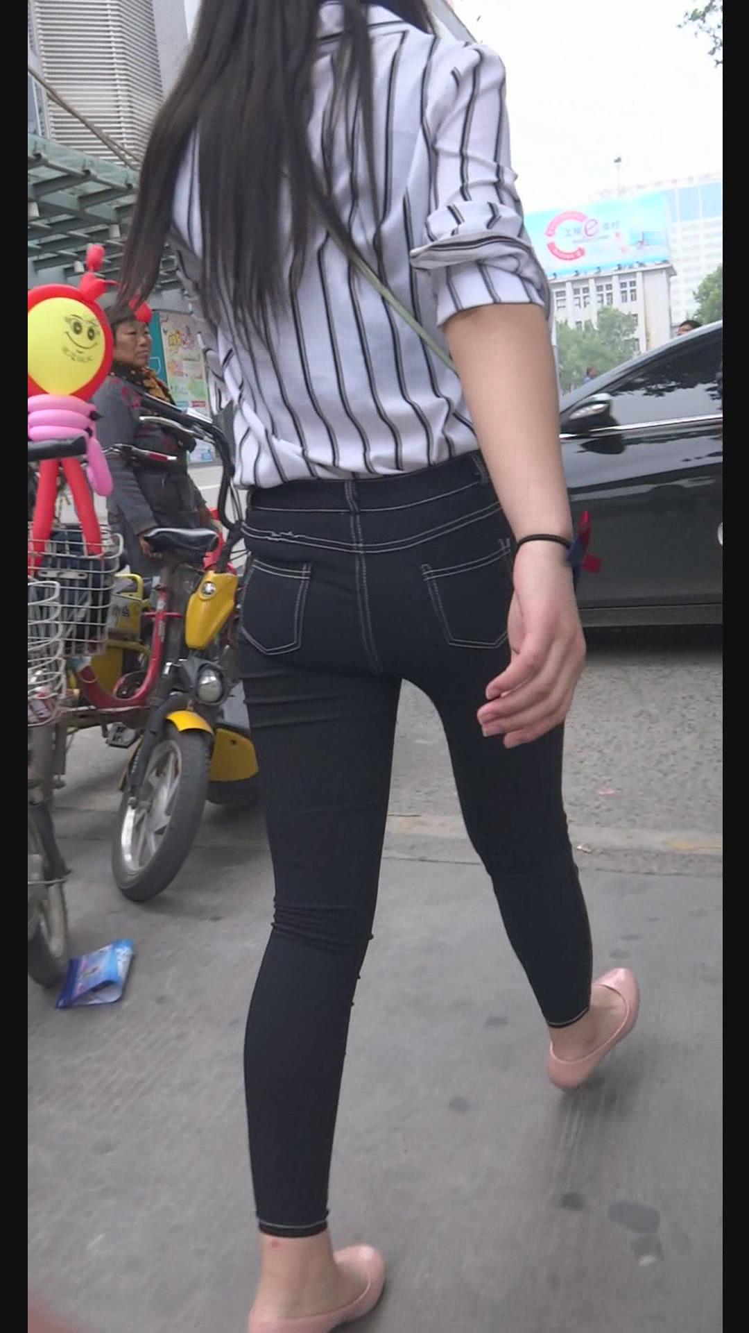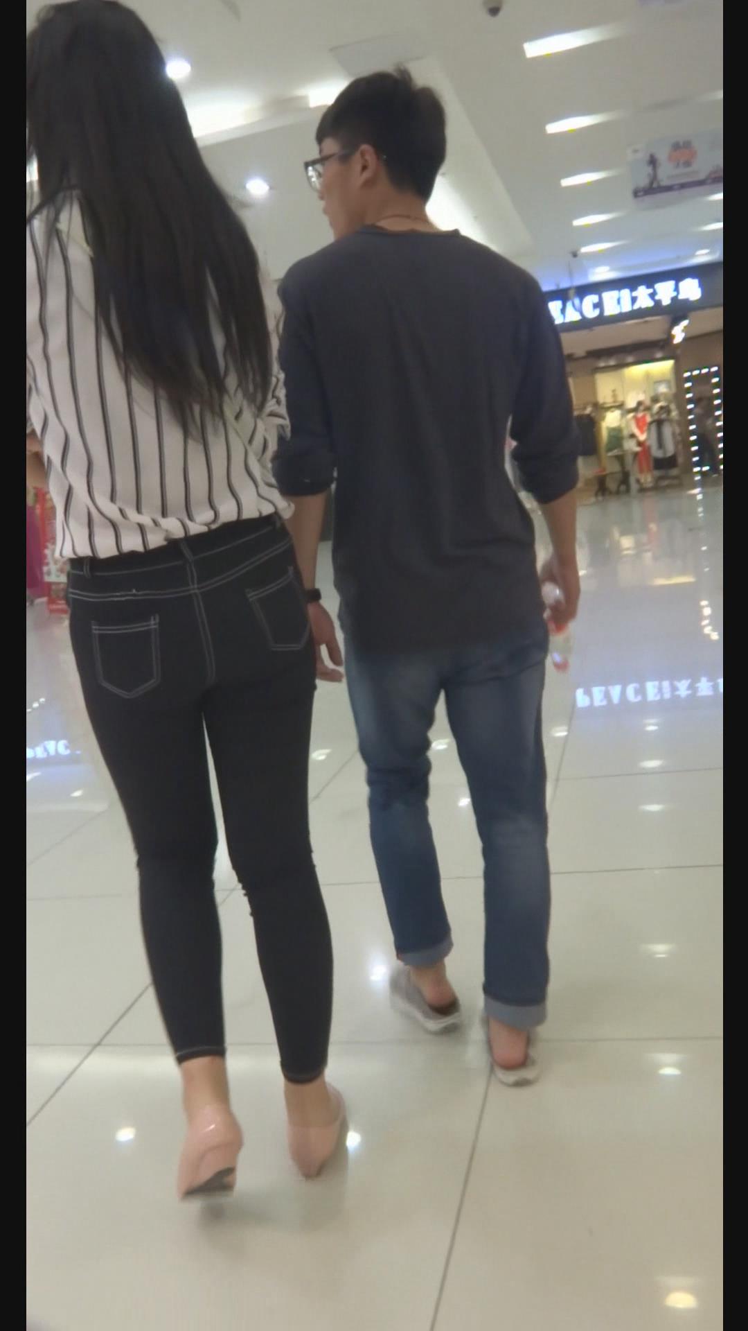 | 街拍条纹白衬衫紧身黑牛美女陪男友逛街。 编号6000 |