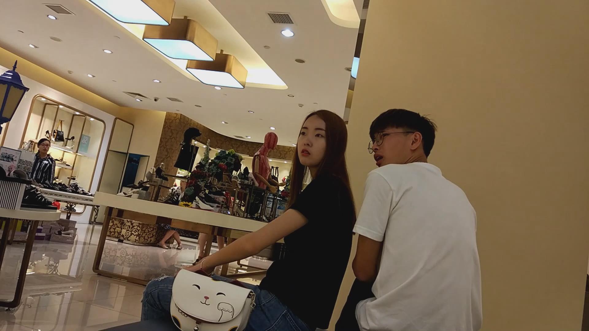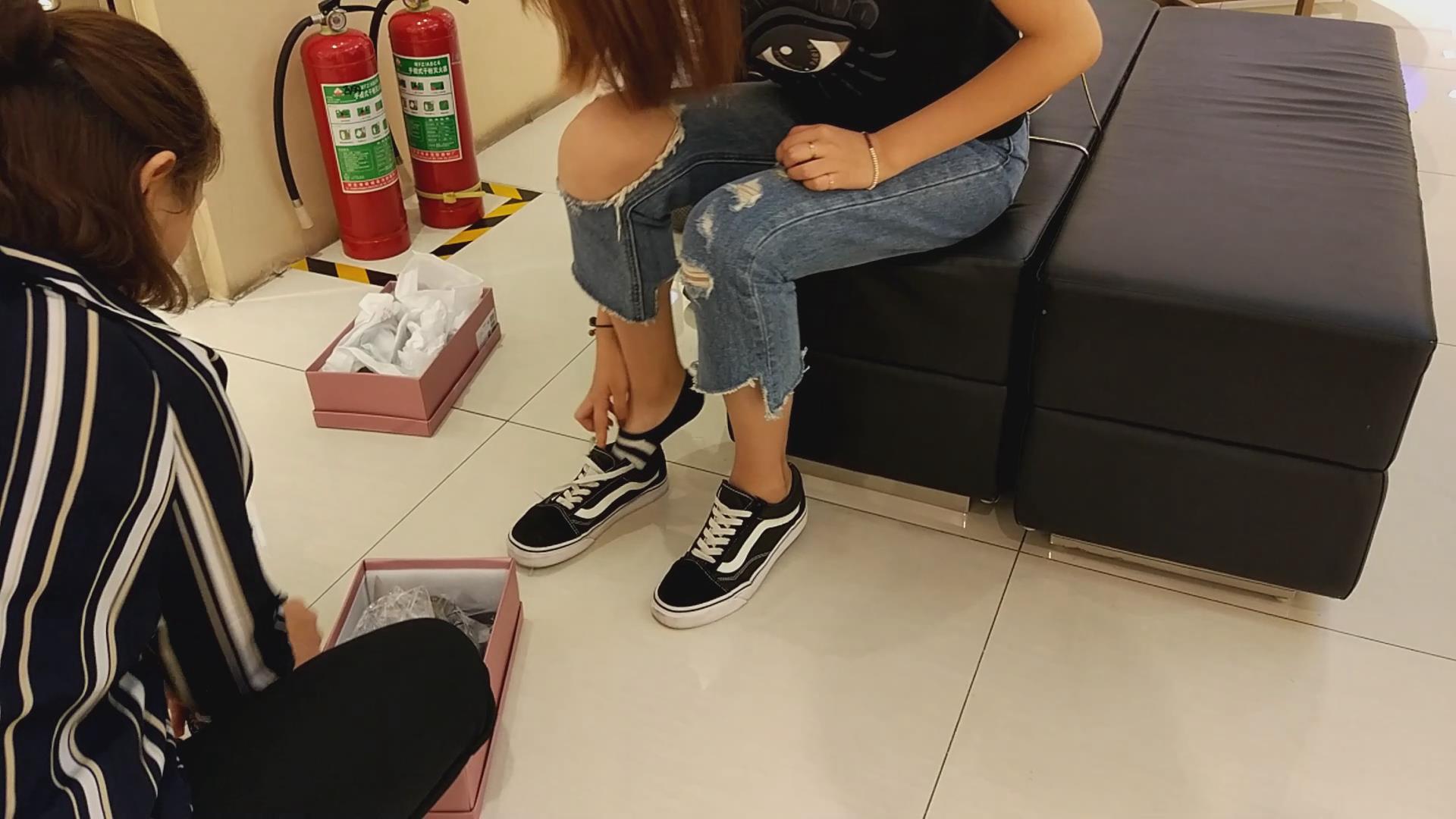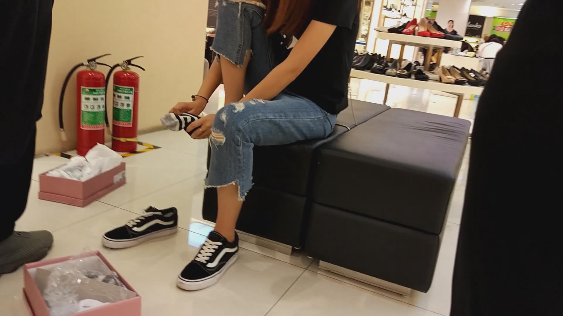 | 黑T恤破洞蓝色牛仔裤美眉鞋店试高跟 编号6436 |