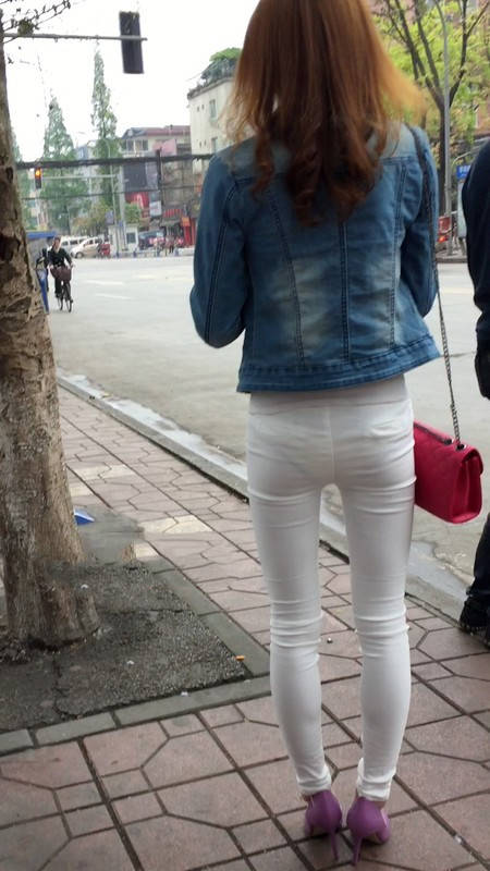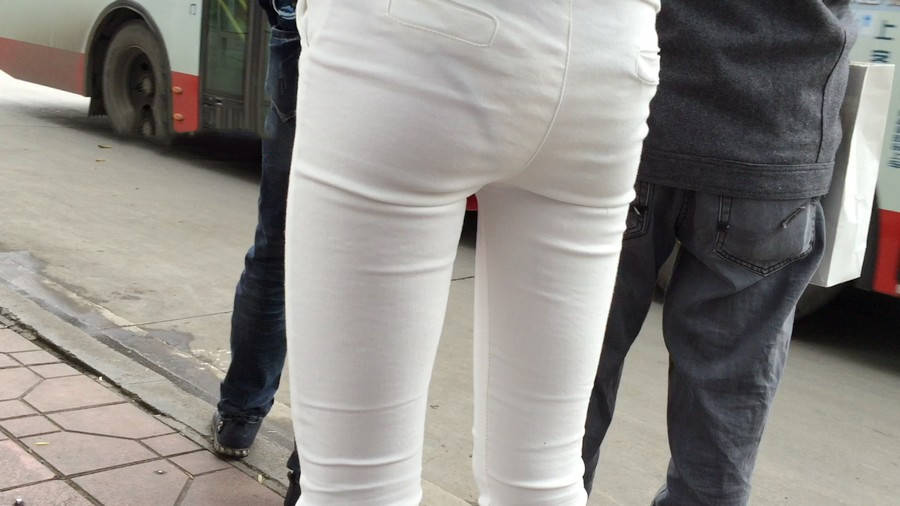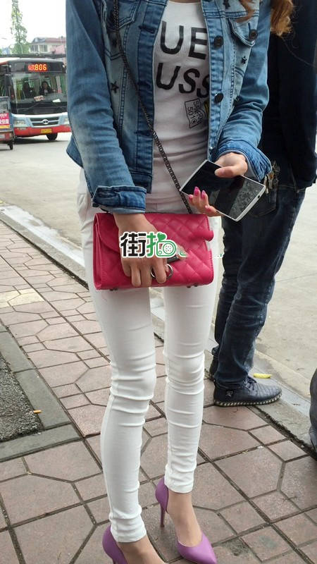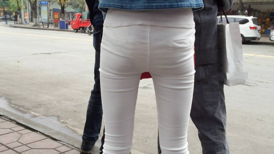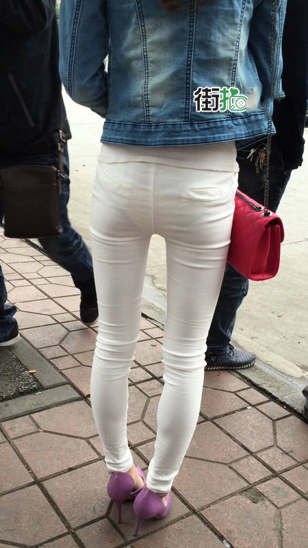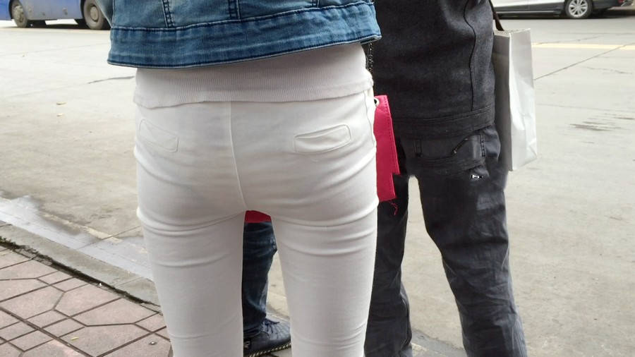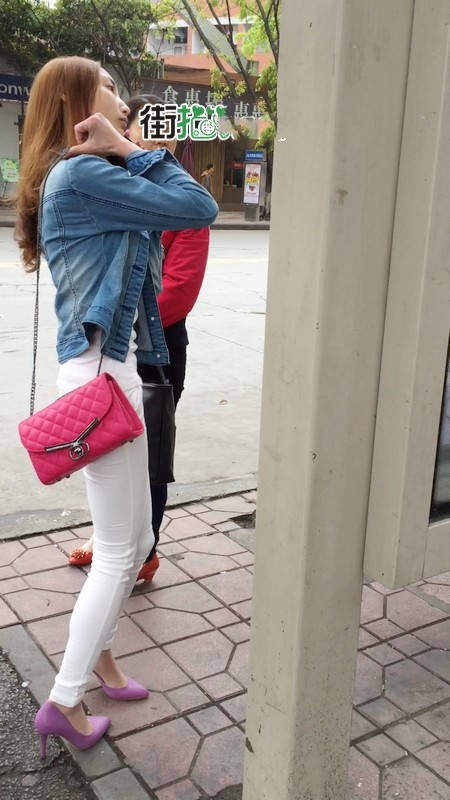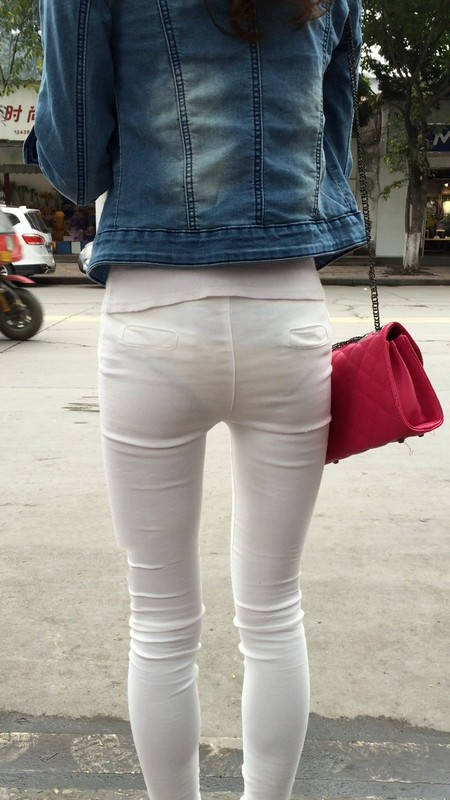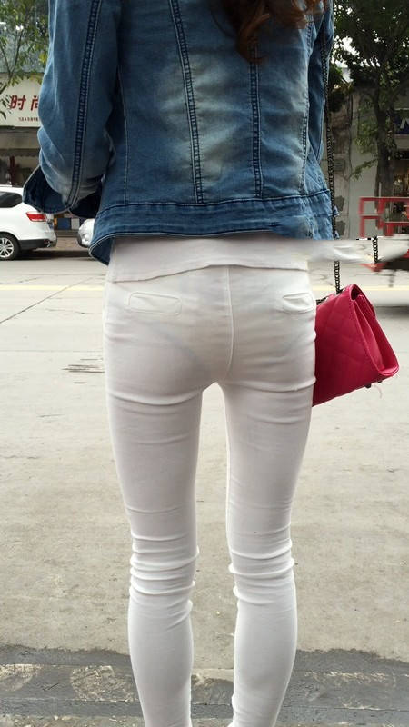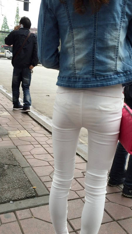 | 【编号1075】街拍紧身薄透白裤女学生等公交 |