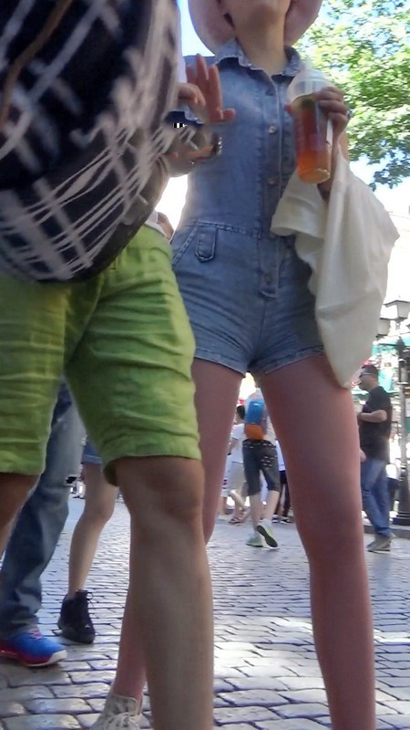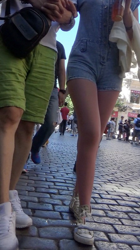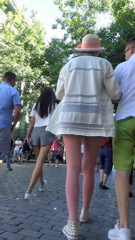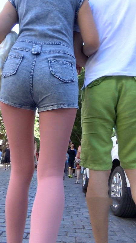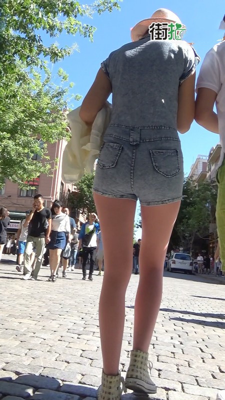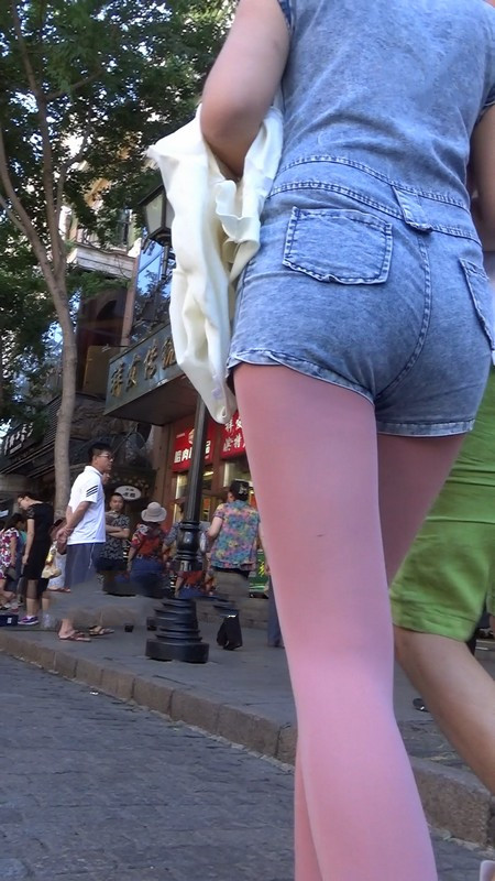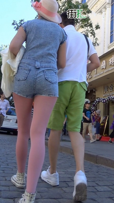 | 【编号1045】街拍粉色丝袜牛仔背带裤长腿MM |