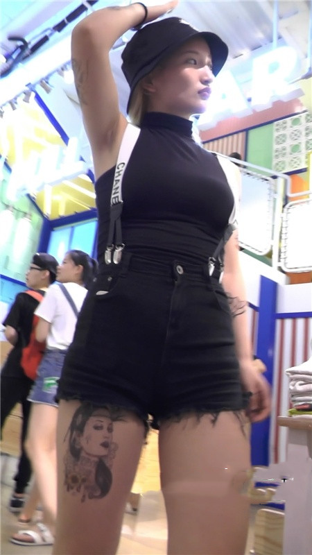 | 【编号1198】街拍黑色紧身短裤纹身月牙妹子 |